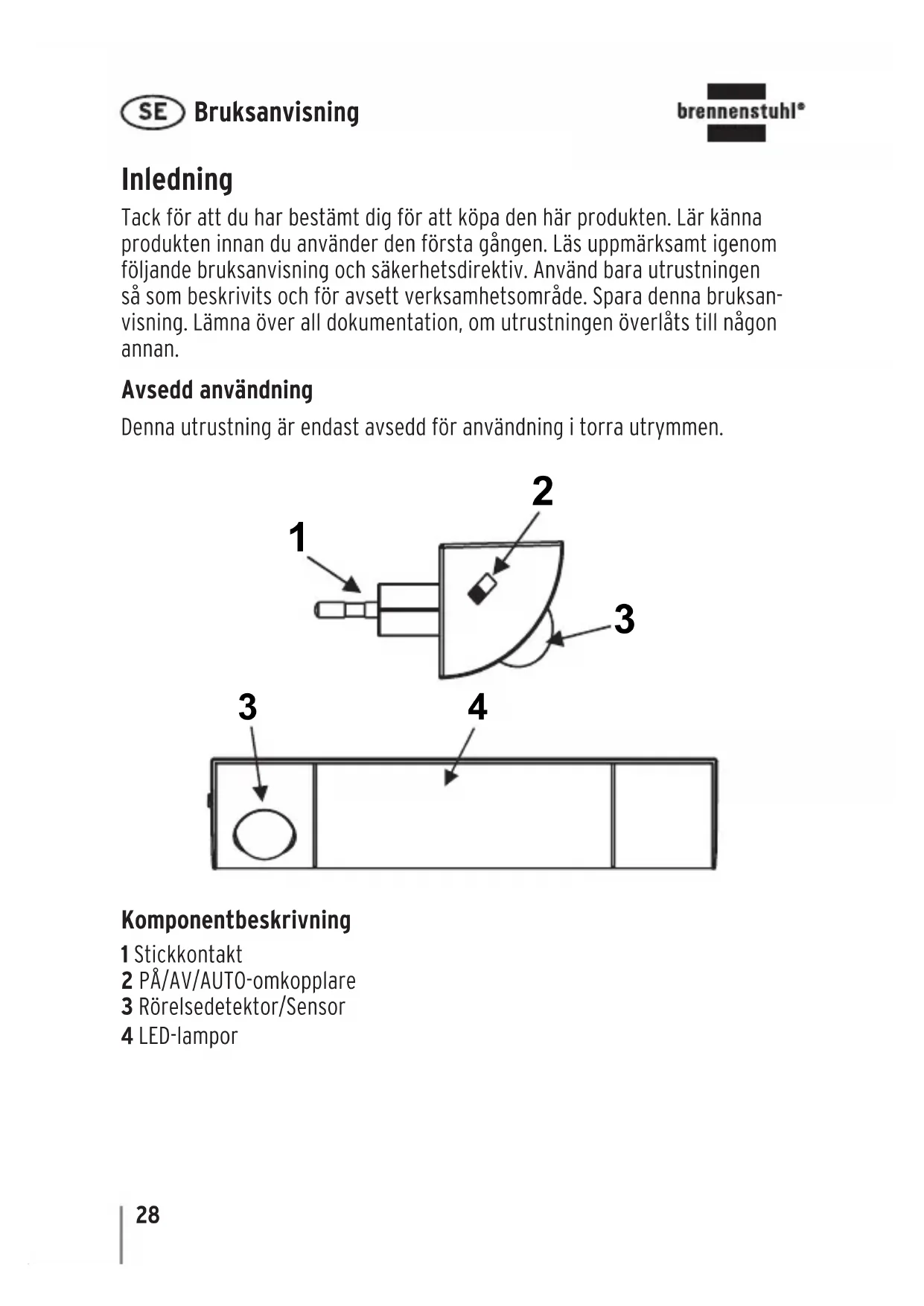 Inledning Tack för att du har bestämt dig för att köpa den här produkten. Lär känna produkten innan du använder den första gången. Läs uppmärksamt igenom följande bruksanvisning och säkerhetsdirektiv. Använd bara utrustningen så som beskrivits och för avsett verksamhetsområde. Spara denna bruksan-visning. Lämna över all dokumentation, om utrustningen överlåts till någon annan. Avsedd användning Denna utrustning är endast avsedd för användning i torra utrymmen. Komponentbeskrivning 1 Stickkontakt2 PÅ/AV/AUTO-omkopplare3 Rörelsedetektor/Sensor4 LED-lampor