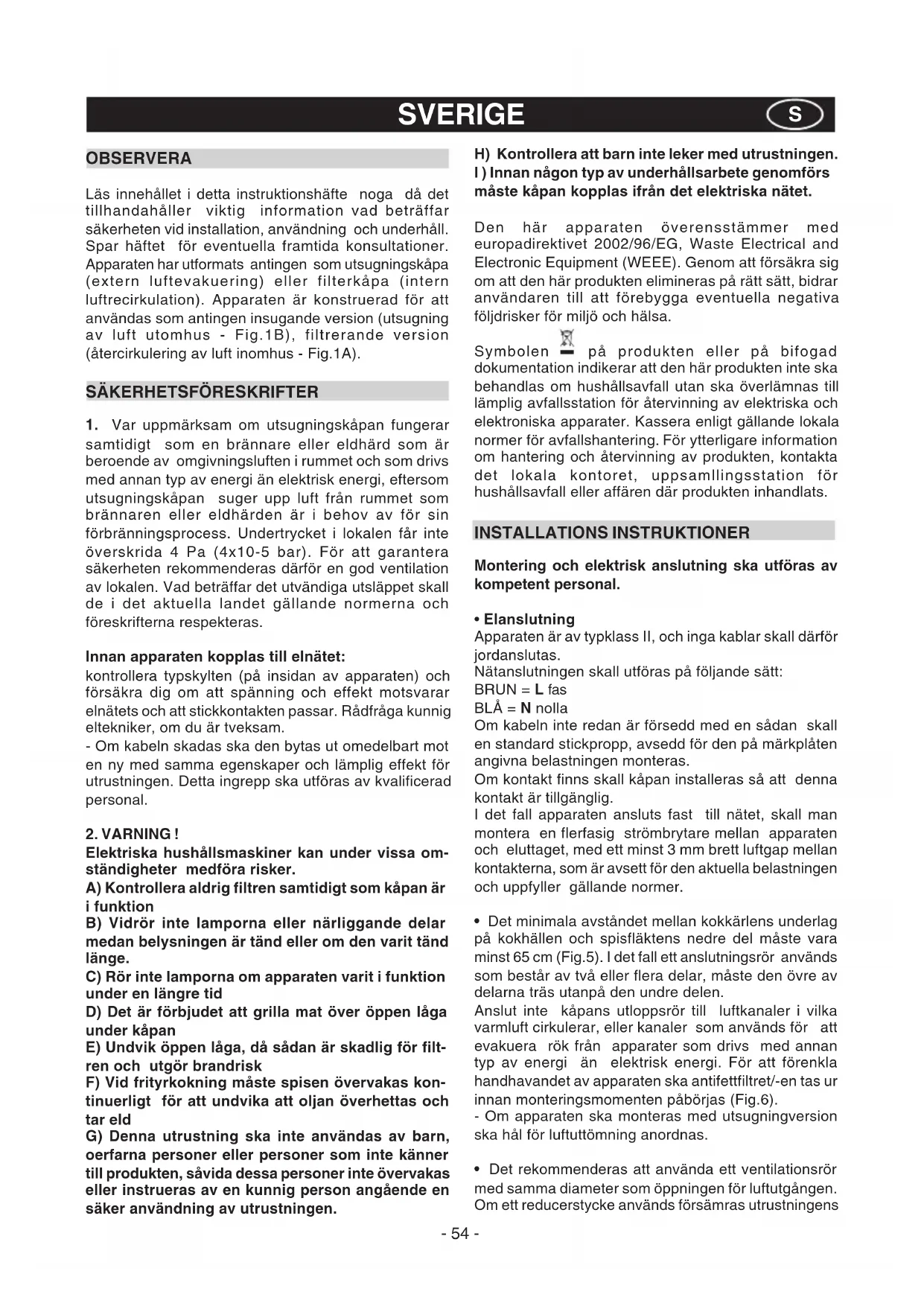 Läs innehålet i detta instruktionshäfte noga dà det tillhandahäller viktig information vad beträffar sakerheten vid installation, använding och underhäll. Spar hättet for eventuella framtida konsultationer. Apparaten har utformats antingen som utsugningskapä (extern luftevakuering) eller filterkapa (intern luftrecirkulation). Apparaten ar konstruerad for att användas som antingen insugande version (utsugning av luft utomhus - Fig.1B), filtrerande version (atercirkulering av luft inomhus - Fig.1A).
