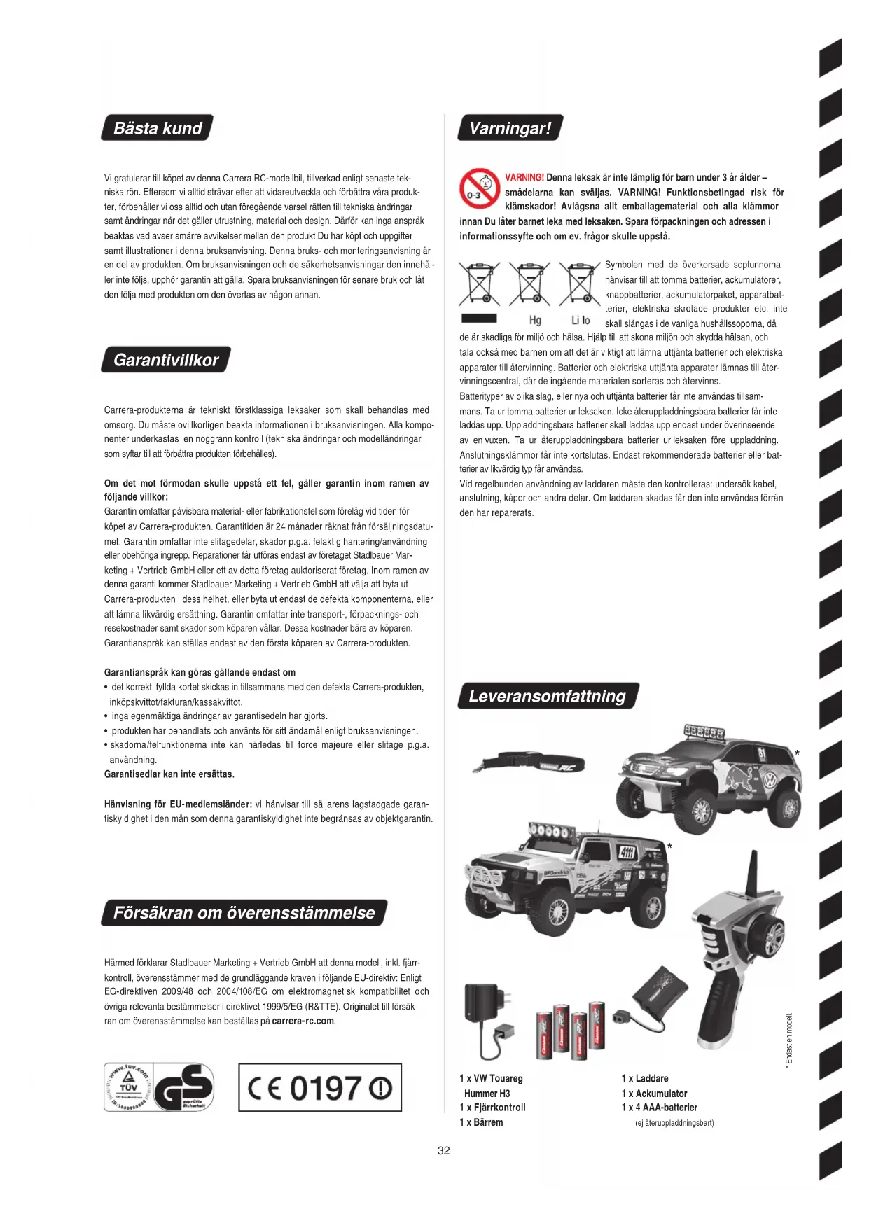 - skadorna/felfunktionerna inte kan härledas till force majeure eller slitage p.g.a. användning. Garantisedlar kan inte ersättas. Hänvisning för EU-medlemsländer: vi hänvisar till säljarens lagstadgade garan- tiskyldighet i den mån som denna garantiskyldighet inte begränsas av objektgarantin. Försäkran om överensstämmelse Härmed förklarar Stadlbauer Marketing + Vertrieb GmbH att denna modell, inkl. fjärr- kontroll, överensstämmer med de grundläggande kraven i följande EU-direktiv: Enligt EG-direktiven 2009/48 och 2004/108/EG om elektromagnetisk kompatibilitet och övriga relevanta bestämmelser i direktivet 1999/5/EG (R&TTE). Originalet till försäk- ran om överensstämmelse kan beställas på carrera-rc.com. Varningar! VARNING! Denna leksak är inte lämplig för barn under 3 år ålder – smådelarna kan sväljas. VARNING! Funktionsbetingad risk för klämskador! Avlägsna allt emballagematerial och alla klämmor innan Du låter barnet leka med leksaken. Spara förpackningen och adressen i informationssyfte och om ev. frågor skulle uppstå. Symbolen med de överkorsade soptunnorna hänvisar till att tomma batterier, ackumulatorer, knappbatterier, ackumulatorpaket, apparatbat- terier, elektriska skrotade produkter etc. inte skall slängas i de vanliga hushållssoporna, då de är skadliga för miljö och hälsa. Hjälp till att skona miljön och skydda hälsan, och tala också med barnen om att det är viktigt att lämna uttjänta batterier och elektriska apparater till återvinning. Batterier och elektriska uttjänta apparater lämnas till åter- vinningscentral, där de ingående materialen sorteras och återvinns. Batterityper av olika slag, eller nya och uttjänta batterier får inte användas tillsam- mans. Ta ur tomma batterier ur leksaken. Icke återuppladdningsbara batterier får inte laddas upp. Uppladdningsbara batterier skall laddas upp endast under överinseende av en vuxen. Ta ur återuppladdningsbara batterier ur leksaken före uppladdning. Anslutningsklämmor får inte kortslutas. Endast rekommenderade batterier eller bat- terier av likvärdig typ får användas. Vid regelbunden användning av laddaren måste den kontrolleras: undersök kabel, anslutning, kåpor och andra delar. Om laddaren skadas får den inte användas förrän den har reparerats. Leveransomfattning 1 x VW Touareg Hummer H3 1 x Fjärrkontroll 1 x Bärrem 1 x Laddare 1 x Ackumulator 1 x 4 AAA-batterier (ej återuppladdningsbart)1