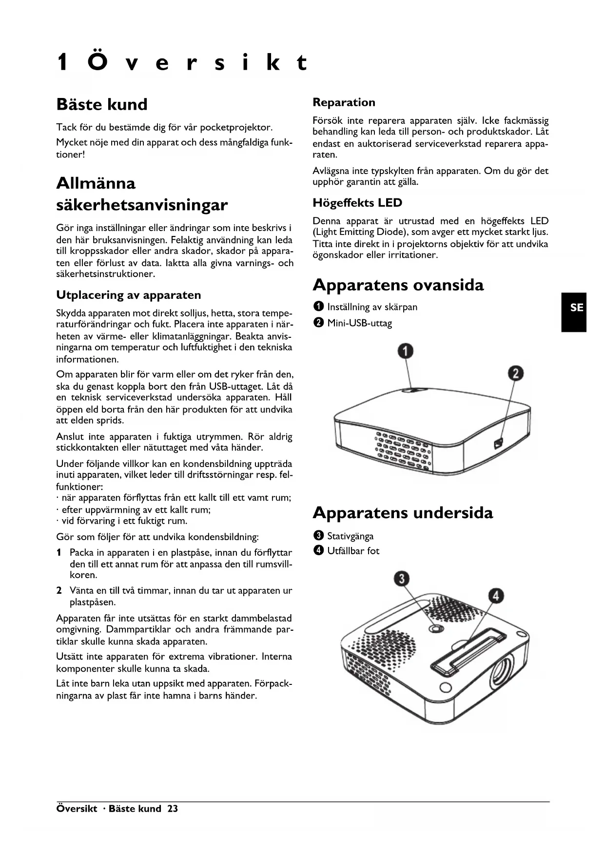 1Översikt Bäste kund Tack för du bestämde dig för vår pocketprojektor. Mycket nöje med din apparat och dess mångfaldiga funk- tioner! Allmänna säkerhetsanvisningar Introduktion 2 Gör inga inställningar eller ändringar som inte beskrivs i den här bruksanvisningen. Felaktig användning kan leda till kroppsskador eller andra skador, skador på appara- ten eller förlust av data. Iaktta alla givna varnings- och säkerhetsinstruktioner. Utplacering av apparaten Skydda apparaten mot direkt solljus Skydda apparaten mot direkt solljus, hetta, stora tempe- raturförändringar och fukt. Placera inte apparaten i när- heten av värme- eller klimatanläggningar. Beakta anvis- ningarna om temperatur och luftfuktighet i den tekniska informationen. Om apparaten blir för varm eller om det ryker från den (USB) Om apparaten blir för varm eller om det ryker från den, ska du genast koppla bort den från USB-uttaget. Låt då en teknisk serviceverkstad undersöka apparaten. Håll öppen eld borta från den här produkten för att undvika att elden sprids. Anslut inte apparaten i fuktiga utrymmen. Anslut inte apparaten i fuktiga utrymmen. Rör aldrig stickkontakten eller nätuttaget med våta händer. Kondensbildning Under följande villkor kan en kondensbildning uppträda inuti apparaten, vilket leder till driftsstörningar resp. fel- funktioner: