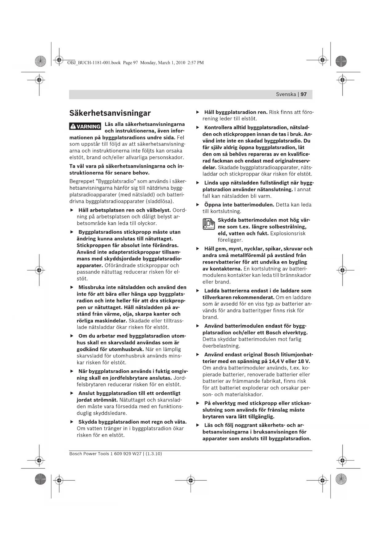 Byt säkringen 32 Interna temperatur- säkringen har löst ut Slå av externa appara- ter och låt bygg- plastradion svalna Byggplatsradion fallerar plötsligt Stickproppen eller batterimodulen inte korrekt eller inte or- dentligt anslutna. Anslut stickproppen eller batterimodulen korrekt och ordentligt Programfel För att återställa pro- grammet dra ut stick- proppen och ta bort batterimodulen, vän- ta 30 s och återanslut stickproppen och bat- terimodulen. Dålig radiomottagning Radion störs av andra apparater eller så är den uppställd på ogynnsam plats Ställ upp byggplatsra- dion på ett annat stäl- le med bättre mottag- ning Antennen är inte kor- rekt inriktad Vrid stavantennen Tidsindikeringen störd Klockans buffertbatte- rier är förbrukade Byt buffertbatterierna Buffertbatterierna in- lagda med fel polning Sätt in buffertbatte- rierna i rätt polrikt- ning Orsak Åtgärd OBJ_BUCH-1181-001.book Page 104 Monday, March 1, 2010 2:57 PMSvenska | 105 Bosch Power Tools 1 609 929 W27 | (1.3.10) Underhåll och service Underhåll och rengöring f Nätsladden är försedd med en speciell sä- kerhetskontakt och får endast bytas ut hos en auktoriserad Bosch servicestation. Om i byggplatsradion trots exakt tillverkning och sträng kontroll störning skulle uppstå, bör reparation utföras av auktoriserad serviceverk- stad för Bosch elverktyg. Ange vid förfrågningar och reservdelsbeställ- ningar ovillkorligen det 10-siffriga objektnumret som finns på byggplatsradions dataskylt. Kundservice och kundkonsulter Kundservicen ger svar på frågor beträffande re- paration och underhåll av produkter och reserv- delar. Sprängskissar och informationer om re- servdelar lämnas även på adressen: www.bosch-pt.com Bosch kundkonsultgruppen hjälper gärna när det gäller frågor beträffande köp, användning och inställning av produkter och tillbehör. Svenska Bosch Service Center Telegrafvej 3 2750 Ballerup Danmark Tel.: +46 (020) 41 44 55 Fax: +46 (011) 18 76 91 Transport Batterimodulen får försändas endast om huset är oskadat. Tejpa över öppna kontakter och för- packa batterimodulen så att den inte kan röras i förpackingen. Vid försändelse an litium-jonbatterier krävs möj- ligen en märkning; undersök vilka föreskrifter som gäller i aktuellt land. Avfallshantering Byggplatsradion, tillbehör och förpackningar skall på miljövänligt sätt lämnas in för återvin- ning. Endast för EU-länder: Släng inte byggplatsradion och in- te heller batterierna i hushållsav- fall! Enligt europeiska direktivet 2002/96/EG för avfall som utgörs av elektriska och elektroniska ap- parater och dess modifiering till nationell rätt måste obrukbara elektriska och elektroniska produkter eller batterier omhändertas separat och på miljövänligt sätt lämnas in för återvin- ning. Sekundär-/primärbatterier: Li-jon: Beakta anvisningarna i avsnit- tet ”Transport”, sida 105. Förbrukade batterier får inte slängas i hushålls- avfall och inte heller i eld eller vatten. Batterier- na ska helst vara urladdade när de samlas för återvinning eller omhändertas på miljövänligt sätt. Endast för EU-länder: Defekta eller förbrukade batterier måste enligt direktivet 2006/66/EG omhändertas för återvin- ning. Ändringar förbehålles. OBJ_BUCH-1181-001.book Page 105 Monday, March 1, 2010 2:57 PM106 | Norsk 1 609 929 W27 | (1.3.10) Bosch Power Tools