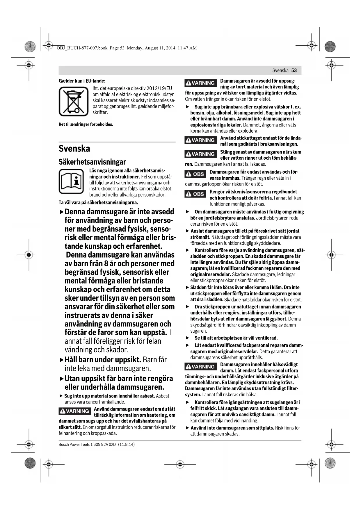 VARNING VARNING VARNING VARNING VARNING OBJ_BUCH-877-007.book Page 53 Monday, August 11, 2014 11:47 AM54 | Svenska 1 609 92A 0XD | (11.8.14) Bosch Power Tools Använd nätsladden och sugslangen omsorgsfullt.