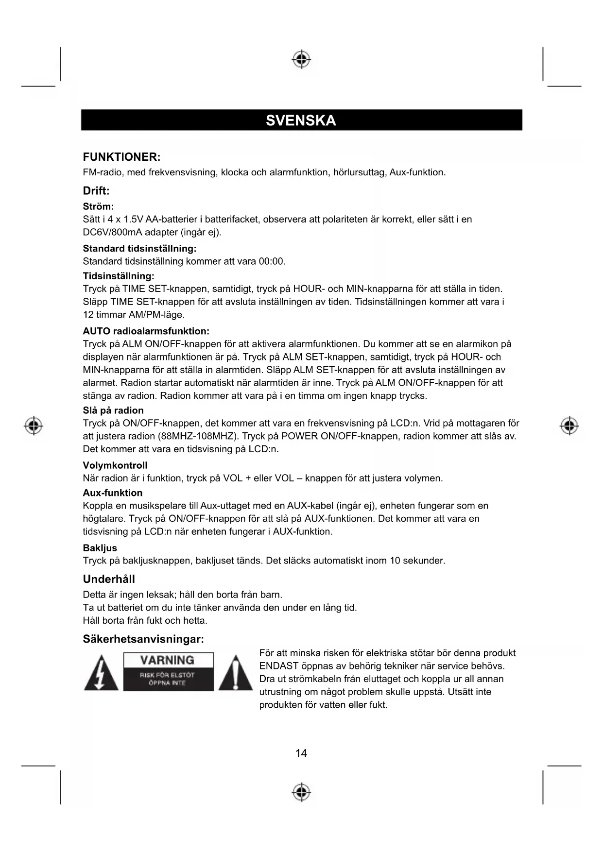For att minska risken for elektriska stötar bördenna produkt ENDAST öppnas av behörig tekniker när service behövs. Dra ut strömkabeln frän eluttaget och koppla ur all annan utrustning om nagot problem skulle uppsta. Utsätt inteprodukten für vatten eller fukt.