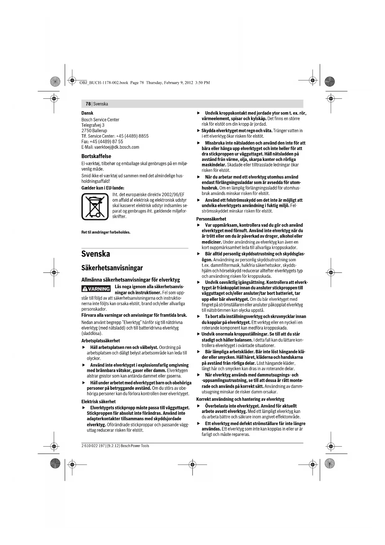 =6,0 =1,5 =5,5 =1,5 OBJ_BUCH-1178-002.book Page 80 Thursday, February 9, 2012 3:50 PMSvenska | 81 Bosch Power Tools 2 610 022 197 | (9.2.12) Mätningen av den vibrationsnivå som anges i denna anvisning har utförts enligt en mätmetod som är standardiserad i EN 60745 och kan användas vid jämförelse av olika elverk- tyg. Mätmetoden är även lämplig för preliminär bedömning av vibrationsbelastningen. Den angivna vibrationsnivån representerar den huvudsakliga användningen av elverktyget. Om däremot elverktyget används för andra ändamål och med andra insatsverktyg eller inte underhållits ordentligt kan vibrationsnivån avvika. Härvid kan vibrationsbelastningen under arbetsperioden öka betyd- ligt. För en exakt bedömning av vibrationsbelastningen bör även de tider beaktas när elverktyget är frånkopplat eller är igång, men inte används. Detta reducerar tydligt vibrationsbelast- ningen för den totala arbetsperioden. Bestäm extra säkerhetsåtgärder för att skydda operatören mot vibrationernas inverkan t. ex.: underhåll av elverktyget och insatsverktygen, att hålla händerna varma, organisation av arbetsförloppen. Försäkran om överensstämmelse Vi försäkrar härmed under exklusivt ansvar att denna produkt som beskrivs i ”Tekniska data” överensstämmer med följande normer och normativa dokument: EN 60745 enligt bestäm- melserna i direktiven 2011/65/EU, 2004/108/EG, 2006/42/EG. Teknisk tillverkningsdokumentation (2006/42/EG) fås från: Robert Bosch GmbH, PT/ETM9, D-70745 Leinfelden-Echterdingen Robert Bosch GmbH, Power Tools Division D-70745 Leinfelden-Echterdingen