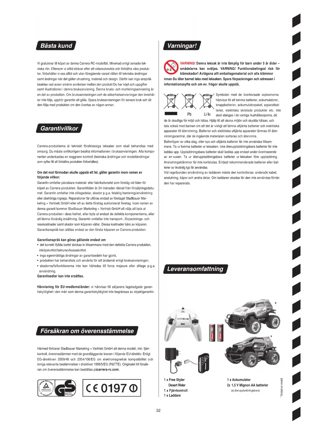- Endast en modell. Bästa kund Vi gratulerar till köpet av denna Carrera RC-modellbil, tillverkad enligt senaste tek- niska rön. Eftersom vi alltid strävar efter att vidareutveckla och förbättra våra produk- ter, förbehåller vi oss alltid och utan föregående varsel rätten till tekniska ändringar samt ändringar när det gäller utrustning, material och design. Därför kan inga anspråk beaktas vad avser smärre avvikelser mellan den produkt Du har köpt och uppgifter samt illustrationer i denna bruksanvisning. Denna bruks- och monteringsanvisning är en del av produkten. Om bruksanvisningen och de säkerhetsanvisningar den innehål- ler inte följs, upphör garantin att gälla. Spara bruksanvisningen för senare bruk och låt den följa med produkten om den övertas av någon annan. Garantivillkor Carrera-produkterna är tekniskt förstklassiga leksaker som skall behandlas med omsorg. Du måste ovillkorligen beakta informationen i bruksanvisningen. Alla kompo- nenter underkastas en noggrann kontroll (tekniska ändringar och modelländringar som syftar till att förbättra produkten förbehålles). Om det mot förmodan skulle up pstå ett fel, gäller garantin inom ramen av följande villkor: Garantin omfattar påvisbara material- eller fabrikationsfel som förelåg vid tiden för köpet av Carrera-produkten. Garantitiden är 24 månader räknat från försäljningsdatu- met. Garantin omfattar inte slitagedelar, skador p.g.a. felaktig hantering/användning eller obehöriga ingrepp. Reparationer får utföras endast av företaget Stadlbauer Mar- keting + Vertrieb GmbH eller ett av detta företag auktoriserat företag. Inom ramen av denna garanti kommer Stadlbauer Marketing + Vertrieb GmbH att välja att byta ut Carrera-produkten i dess helhet, eller byta ut endast de defekta komponenterna, eller att lämna likvärdig ersättning. Garantin omfattar inte transport-, förpacknings- och resekostnader samt skador som köparen vållar. Dessa kostnader bärs av köparen. Garantianspråk kan ställas endast av den första köparen av Carrera-produkten. Garantianspråk kan göras gällande endast om