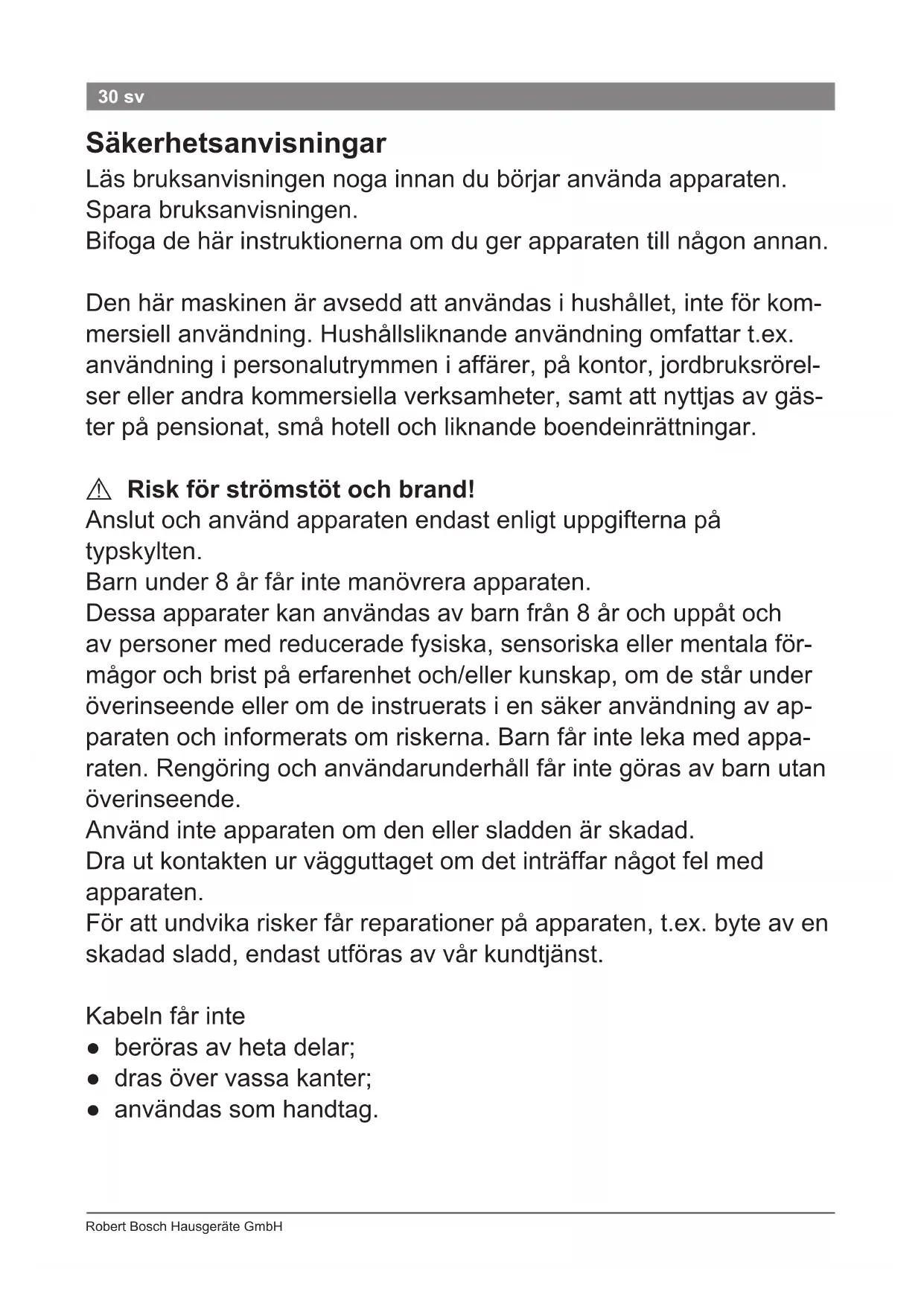 Livsfara! Apparaten får inte komma i beröring med vatten. Farligt även när apparaten är avstängd. Därför skall kontakten dras ur vägguttaget efter användningen och vid avbrott i användningen. Ytterligare skydd fås om en jordfelsbrytare på upp till 30 mA monte- ras in i fastighetsinstallationen. Rådgör med en elinstallatör.