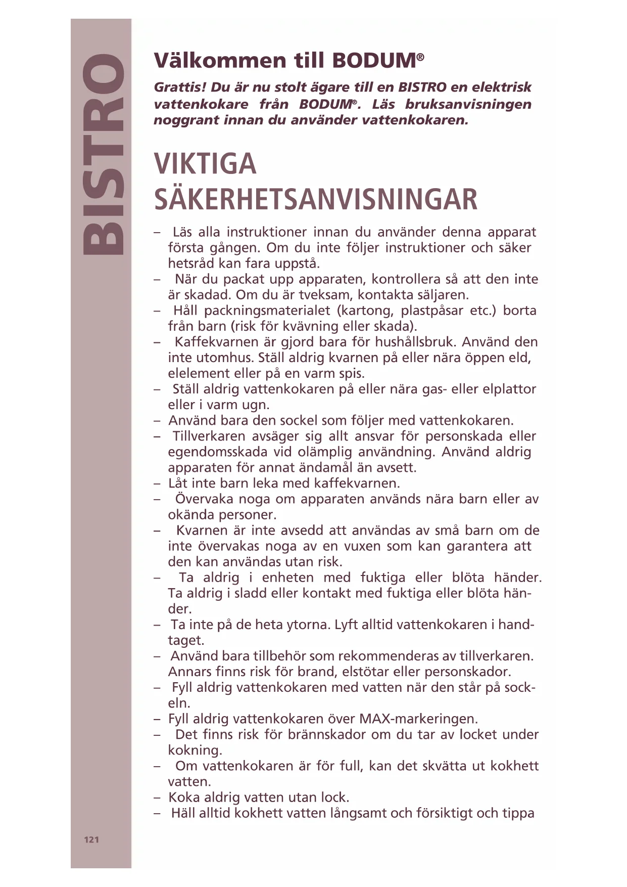 . Läs bruksanvisningen noggrant innan du använder vattenkokaren. VIKTIGA SÄKERHETSANVISNINGAR – Läs alla instruktioner innan du använder denna apparat första gången. Om du inte följer instruktioner och säker hetsråd kan fara uppstå. – När du packat upp apparaten, kontrollera så att den inte är skadad. Om du är tveksam, kontakta säljaren. – Håll packningsmaterialet (kartong, plastpåsar etc.) borta från barn (risk för kvävning eller skada). – Kaffekvarnen är gjord bara för hushållsbruk. Använd den inte utomhus. Ställ aldrig kvarnen på eller nära öppen eld, elelement eller på en varm spis. – Ställ aldrig vattenkokaren på eller nära gas- eller elplattor eller i varm ugn. – Använd bara den sockel som följer med vattenkokaren. – Tillverkaren avsäger sig allt ansvar för personskada eller egendomsskada vid olämplig användning. Använd aldrig apparaten för annat ändamål än avsett. – Låt inte barn leka med kaffekvarnen. – Övervaka noga om apparaten används nära barn eller av okända personer. – Kvarnen är inte avsedd att användas av små barn om de inte övervakas noga av en vuxen som kan garantera att den kan användas utan risk. – Ta aldrig i enheten med fuktiga eller blöta händer. Ta aldrig i sladd eller kontakt med fuktiga eller blöta hän- der. – Ta inte på de heta ytorna. Lyft alltid vattenkokaren i hand- taget. – Använd bara tillbehör som rekommenderas av tillverkaren. Annars finns risk för brand, elstötar eller personskador. – Fyll aldrig vattenkokaren med vatten när den står på sock- eln. – Fyll aldrig vattenkokaren över MAX-markeringen. – Det finns risk för brännskador om du tar av locket under kokning. – Om vattenkokaren är för full, kan det skvätta ut kokhett vatten. – Koka aldrig vatten utan lock. – Häll alltid kokhett vatten långsamt och försiktigt och tippa122 BRUKSANVISNING inte för vattenkokarens pip för snabbt. – Undvik brännskador. Se till så att du inte kommer i kontakt med den ånga som uppstår vid det uppfällbara locket vid kokning eller direkt efter att du slagit av vatten-kokaren. Öppna locket försiktigt om vattenkokaren fortfarande är varm och du vill fylla på vatten. – Kokande vatten kan ge brännskador! – Flytta apparaten väldigt försiktigt när det är hett vatten inuti. – Lås aldrig brytaren i PÅ-läge med våld och påverka inte brytaren så att den stannar i PÅ-läge. Det kan leda till att det strömmar ut ånga runt locket som skadar den automatiska avstängningsmekanismen eller som kan leda till personskador. – Sänk aldrig ned enheten i vatten. Glöm inte att det här är en elprodukt. – Torka bara av enheten med fuktig trasa. – Stäng av genom att slå AV strömbrytaren och sedan dra ur kontakten. – Dra alltid ur sladden genom att hålla i kontakten, inte slad- den. – Se till så att sladden inte hänger över bordseller bänk- kanten eller kommer i kontakt med heta ytor. – Dra alltid ur sladden när du inte använder vattenkokaren eller rengör den. Låt vattenkokaren svalna innan du plac- erar eller avlägsnar delar. – Undvik en farlig situation och försök aldrig själv byta ut apparatens nätsladd, detta kan endast ske med särskilda verktyg. Skador på apparaten får bara repareras av tillverk- aren eller behörig återförsäljare för att du inte ska utsättas för onödiga risker. – Anslut aldrig andra apparater till den sladdlösa sockeln och påverka inte anslutningen (specialspärrar gör att de strömförande ledarna inte kommer kontakt förrän vattenkokaren står på sockeln). – Undvik risk för brand och elstötar - ta aldrig isär vatten- kokare och sockel. INSTALLERING – Placera kaffekvarnen på en stabil yta som inte är het eller nära en värmekälla. Underlaget skall vara torrt. Förvara apparaten och sladden utom räckhåll för barn. – Ställ aldrig sockeln på metallbrickor eller metallytor när du använder den. – Kontrollera att angiven nätspänning på märkplåten stämmer med nätspänningen i ditt område. Anslut endast utrustningen till ett jordat uttag säkrat med minst en 6 A säkring. Använd en jordfelsbrytare (rådfråga en elektriker). När du använder kvarnen skall sladden vara inom räckhåll,123 BISTRO om det skulle ske en olycka. Tillverkaren avsäger sig allt ansvar för olyckor som beror på felaktig eller saknad jord- ning av apparaten. – Om elkontakten är olämplig för att ansluta kontakten på apparaten i, låt en behörig elektriker byta ut den. SPARA BRUKSANVISNINGEN VATTENKOKARENS DELAR 1 Uppfällbart lock 2 Locklås 3 Kalkfilter 4 Nivåindikering 5 PÅ/AV-brytare 6 PÅ/AV-indikering 7 Sockel 8 Indikering för max. vattennivå 9 Indikering för min. vattennivå SPECIALANVISNINGAR SLADDEN – Sladden är kort för att minska risken att trassla in sig eller snubbla över en lång sladd. – Om du är försiktig, så kan du ansluta en förlängningssladd. – Förlängningssladdens ska minst ha samma klassning som vattenkokaren. Har vattenkokaren jordanslutning, ska för- längningssladden vara en 3-polig jordad sladd. Den förlän- gda sladden får inte hänga över bänk- eller bordsytan, så att barn kan få tag i den eller någon kan snubbla på den.