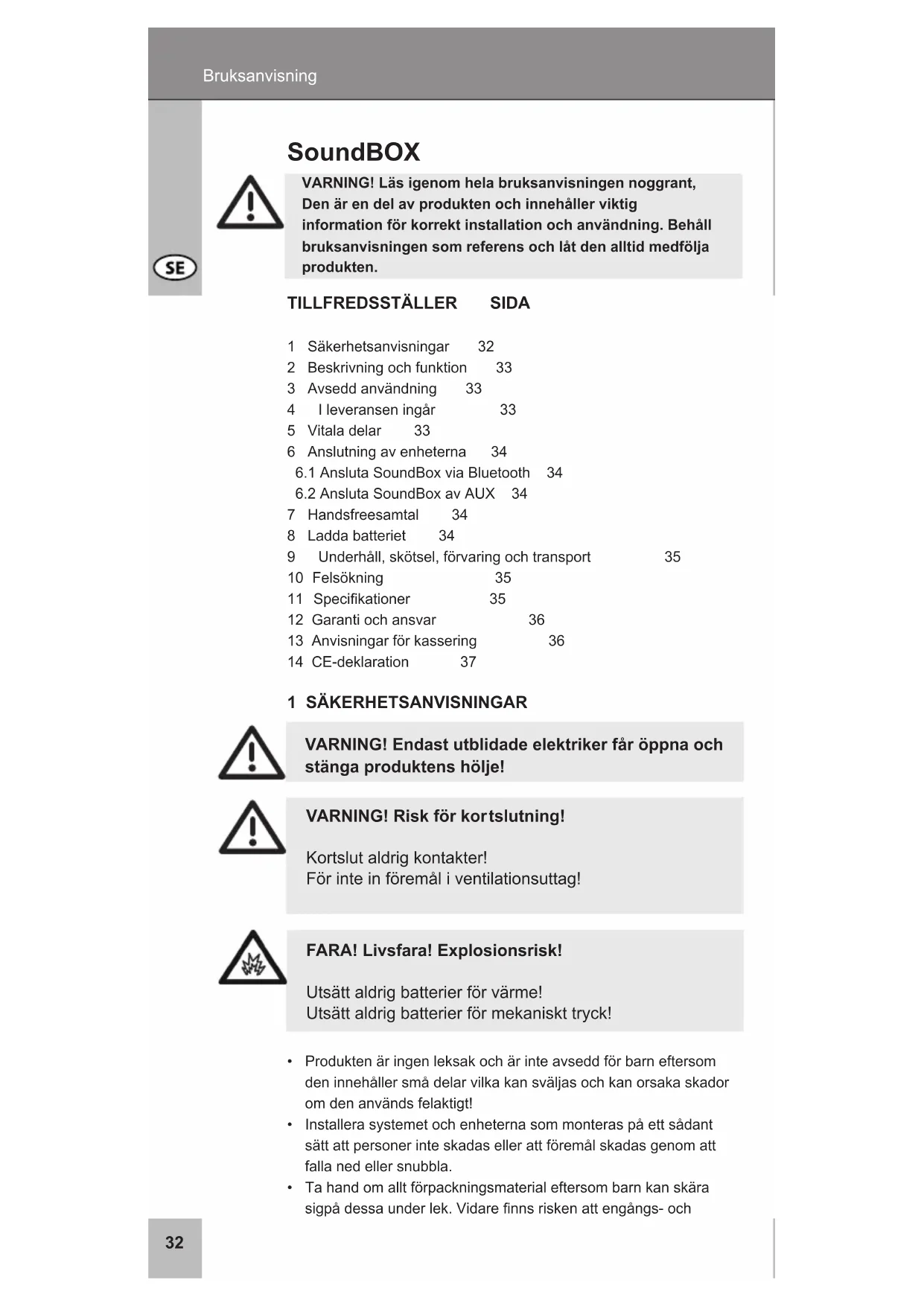 7 Handsfreesamtal 34 8 Ladda batteriet 34 9 Underhåll,skötsel,förvaringochtransport 35 10 Felsökning 35 11Specikationer 35 12 Garanti och ansvar 36 13Anvisningarförkassering 36 14 CE-deklaration 37 1 SÄKERHETSANVISNINGAR VARNING! Endast utblidade elektriker får öppna och stänga produktens hölje!