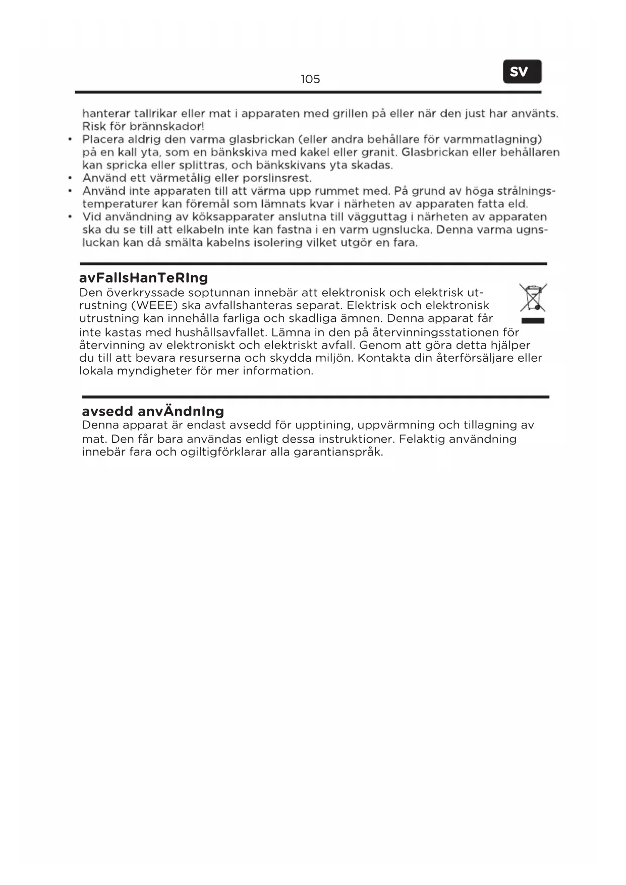Den överkryssade soptunnan innebär att elektronisk och elektrisk ut- rustning (WEEE) ska avfallshanteras separat. Elektrisk och elektronisk utrustning kan innehålla farliga och skadliga ämnen. Denna apparat får inte kastas med hushållsavfallet. Lämna in den på återvinningsstationen för återvinning av elektroniskt och elektriskt avfall. Genom att göra detta hjälper du till att bevara resurserna och skydda miljön. Kontakta din återförsäljare eller lokala myndigheter för mer information. avFallsHanTeRIng Denna apparat är endast avsedd för upptining, uppvärmning och tillagning av mat. Den får bara användas enligt dessa instruktioner. Felaktig användning innebär fara och ogiltigförklarar alla garantianspråk. avsedd anvÄndnIng106