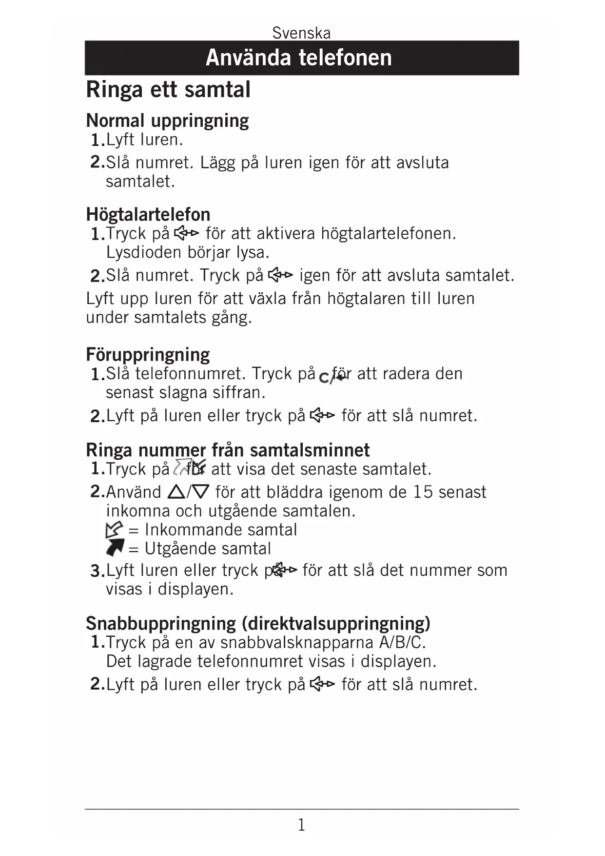 igen för att avsluta samtalet. Lyft upp luren för att växla från högtalaren till luren under samtalets gång. Föruppringning Slå telefonnumret. Tryck på för att radera den senast slagna siffran. Lyft på luren eller tryck på