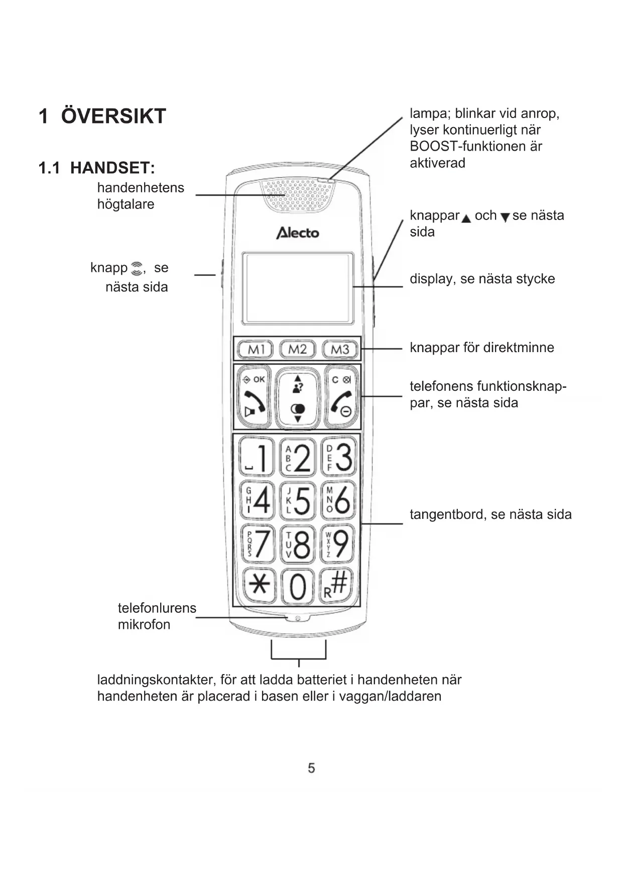tangentbord, se nästa sida telefonens funktionsknap- par, se nästa sida knappar för direktminne lampa; blinkar vid anrop, lyser kontinuerligt när BOOST-funktionen är aktiveradBOOST-knappen: tryck under samtalet för att slå på den extra förstärkaren knappar och : för att öka eller minska mottagarens volym under samtalet från viloläge, tryck för att öppna menyn tryck på under inställning för att bekräfta en inställning tryck för att ta emot ett samtal eller för att starta ett telefonsamtal under samtalet tryck igen för att slå på eller av högtalarfunktionen från viloläge, tryck för att komma till nummerminnet när den används, tryck för att bläddra bland minnena eller inställningarna under ett samtal, tryck på för att höja volymen tryck för att öppna det senaste nummerminnet när det inte används vid användning, tryck för att bläddra bland minnen eller inställningar tryck för att sänka volymen under ett samtal korrigeringsknapp vid inmatning av telefonnummer och namn under samtal: tryck för att stänga av mikrofonen tryck för att starta ett intercom-samtal från viloläge under en inställning: tryck för att gå tillbaka ett steg tryck för att avsluta ett telefonsamtal tryck och håll in (>5 sek) för att stänga av luren tangent 0-9: för att ringa telefonnummer och komma till minnen tangent 0: tryck och håll in för att göra en uppringningspaus asterisk- och hashtangenter; används t.ex. för telefonbank R-knapp: funktionsknapp i vissa teletjänster1.2 DISPLAY: blinkar när handenheten har förlorat kontakten med basenheten lyser kontinuerligt när luren är inom räckhåll för basenheten blinkar när ett externt samtal tas emot tänds kontinuerligt under ett telefonsamtal blinkar när du tar emot ett internt samtal lyser kontinuerligt under intercom-samtal tänds när högtalarfunktionen är aktiverad tänds när du söker efter nya samtal i nummerpresentatörsminnet indikerar status för de laddningsbara batterierna: = batterierna är fulla = batterierna är 2/3 fulla = batterierna är 1/3 fulla, ladda dem nu så snart som möjligt = batterierna är tomma, handenheten stängs nu av och du kan inte längre ringa Under laddningen försvinner batterisymbolen tills batterierna är helt laddade tänds om numret är längre än vad som kan visas på displayen (tryck på # för att se resten av numret) namn på telefonluren (HS) och internt nummer (1)tänds när du har fått ett meddelande från en röstbrevlåda (endast FSK-system) tänds när alarmfunktionen (väckning) är aktiverad tänds när klockljudet är inställt på 0 (avstängt)