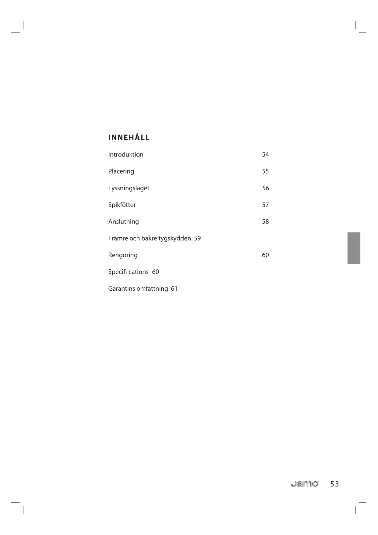 - Fejl i øvrigt på grund af forhold eller omstændigheder, som leverandøren ikke er ansvarlig for Omkostninger til transport i forbindelse med servicering er ikke omfattet af garantien. Leverandøren er alene forpligtet til at udbedre eller omlevere fejlbehæftede dele eller produkter, og leverandøren er ikke ansvarlig for indirekte tab og/eller følgeskader i øvrigt ved brugen af produktet. Erstatningen kan ikke overstige værdien af det leverede. I det omfang nærværende betingelser, herunder ansvarsbegrænsning m.v., måtte stride mod ufravigelige regler i kundens bopælsland har disse regler forrang i forholdet til nærværende bestemmelser.50 www.jamo.com51 OWNERS MANUAL Jamo R 90752 svenska53 INNEHÅLL Introduktion 54 Placering 55 Lyssningsläget 56 Spikfötter 57 Anslutning 58 Främre och bakre tygskydden 59 Rengöring 60 Specifi cations 60 Garantins omfattning 6154 INTRODUKTION Välkommen till den exklusiva cirkeln av Jamo R 907-ägare! Den här bruksanvisningen ger dig en snabb överblick över hur du kopplar in dina högtalare i rummet. För mer ingående information om själva tekniken hänvisar vi dig till R 907-högtalarens tekniska beskrivning. Först ett gott råd. När du är klar med inkopplingen av dina R 907, ta några dagar på dig för att lyssna till dem innan du börjar fi njustera ljudet. Detta tjänar två syften. För det första får du en känsla av hur de här högtalarna låter. För det andra ger det högtalarna en inspelningsperiod. Högtalarens tonkvalitet förändras något efter de första dagarnas musiklyssning. Kom ihåg att anvisningarna i denna bruksanvisning endast är en rekommendation. Det fi nns inga benhårda regler för hur man kopplar in ett par högtalare så pass unika som de här. När du börjar fi njustera deras prestanda i rummet, var inte rädd för att experimentera: alla högtalare låter annorlunda när de fl yttas några centimeter. Känn dig fri att ändra högtalarnas läge och fl ytta runt dem i rummet för att bestämma vad som är det bästa lyssnar- och ljudläget för just dig. Lita alltid på ditt eget omdöme när du bestämmer vad som låter bäst. Det gör vi… Lyssna och njut! français55 PLACERING Som startläge föreslår vi att du först placerar dina R 907 cirka 90 cm från bakväggen och cirka 120 cm från sidoväggen. Att vinkla högtalarna 10 grader mot bakväggen kommer att återkasta det utsända ljudet från bakväggen och sidoväggarna, vilket ger ett akustiskt intryck av att rummet är mycket större än det är. Kom också ihåg att en dipolhögtalare knappt sänder ut något ljud alls från sidan. Du kan använda denna egenskap för att hejda refl ektioner från sidoväggen genom att variera toe-in vinkeln. 3 ft 4 ft 10˚56 30˚ 30˚ LYSSNINGSLÄGET För att hitta bästa lyssningsläget ställer du dig i en 30 graders vinkel från varje högtalare. Genom att göra så placerar du dig på ungefär samma avstånd från högtalarna som det verkliga mellanrummet mellan dem. Fördelen med detta är att de direktutsända ljuden från varje högtalare korsar varandra i en punkt bakom dig.