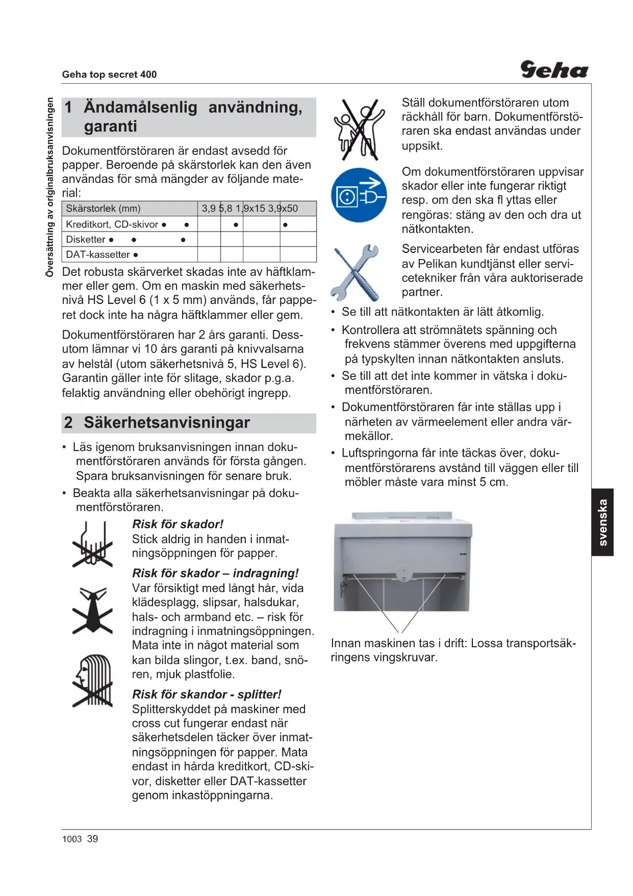 - EN 60950-1:20061003 39 Geha top secret 400 svenska Innan maskinen tas i drift: Lossa transportsäk- ringens vingskruvar. Dokumentförstöraren är endast avsedd för papper. Beroende på skärstorlek kan den även användas för små mängder av följande mate- rial: Skärstorlek (mm) 3,9 5,8 1,9x15 3,9x50 Kreditkort, CD-skivor ●● ● ● Disketter ●● ● DAT-kassetter ● Det robusta skärverket skadas inte av häftklam- mer eller gem. Om en maskin med säkerhets- nivå HS Level 6 (1 x 5 mm) används, får pappe- ret dock inte ha några häftklammer eller gem. Dokumentförstöraren har 2 års garanti. Dess- utom lämnar vi 10 års garanti på knivvalsarna av helstål (utom säkerhetsnivå 5, HS Level 6). Garantin gäller inte för slitage, skador p.g.a. felaktig användning eller obehörigt ingrepp. 1 Ändamålsenlig användning, garanti Ställ dokumentförstöraren utom räckhåll för barn. Dokumentförstö- raren ska endast användas under uppsikt. Om dokumentförstöraren uppvisar skador eller inte fungerar riktigt resp. om den ska fl yttas eller rengöras: stäng av den och dra ut nätkontakten. Servicearbeten får endast utföras av Pelikan kundtjänst eller servi- cetekniker från våra auktoriserade partner.