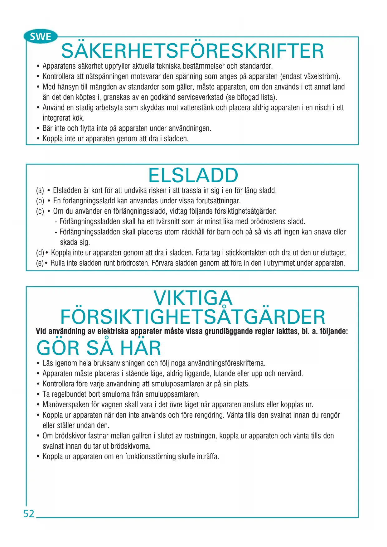 VIKTIGA FÖRSIKTIGHETSÅTGÄRDER Vid användning av elektriska apparater måste vissa grundläggande regler iakttas, bl. a. följande: