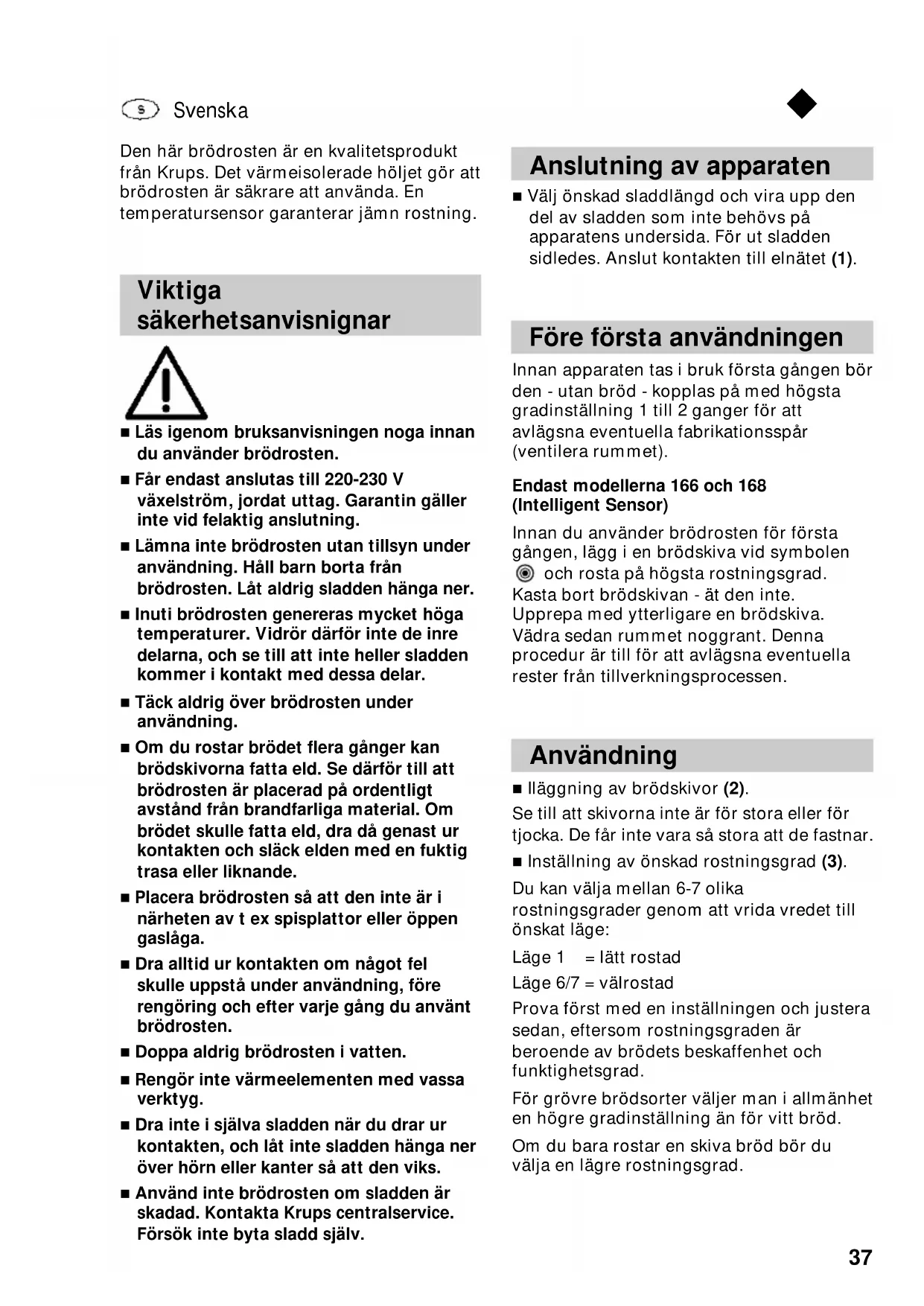 brödrosten. Låt aldrig sladden hänga ner.