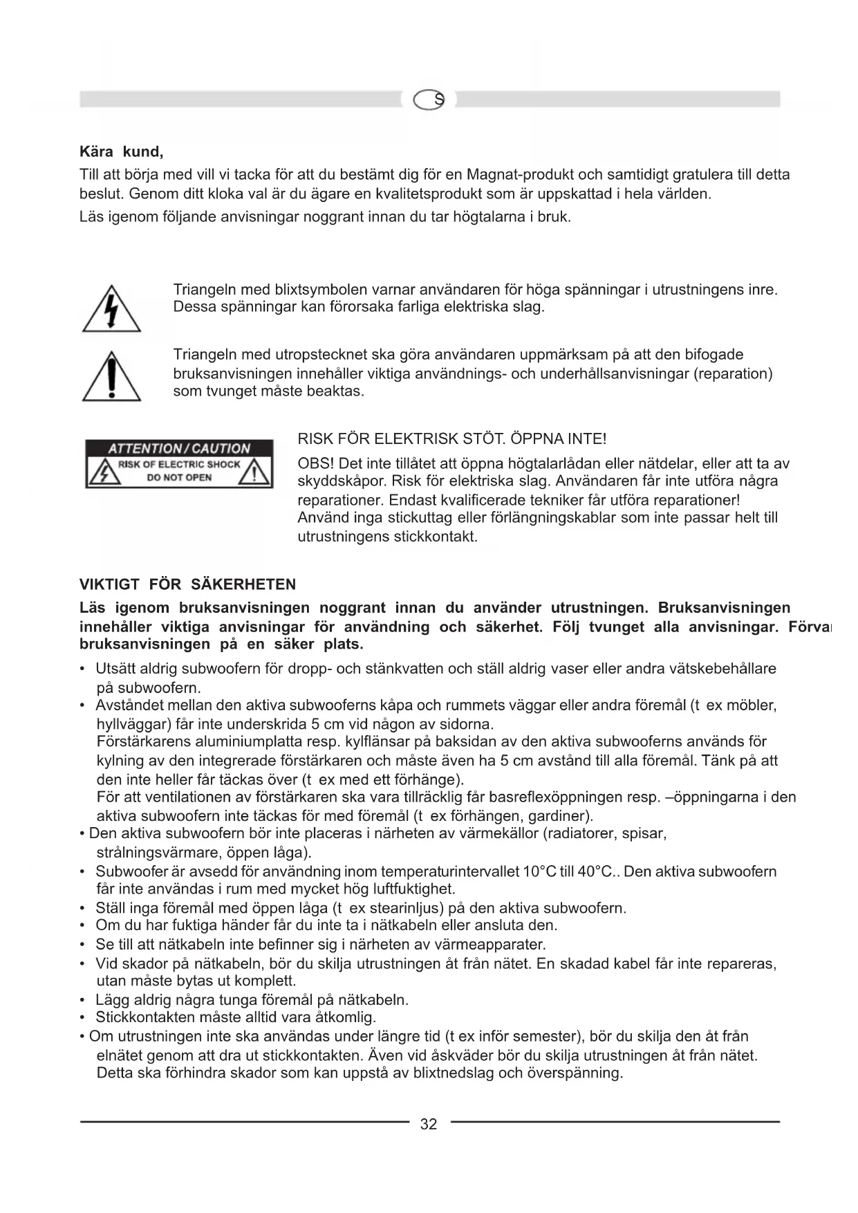 PKära kund, Till att börja med vill vi tacka för att du bestämt dig för en Magnat-produkt och samtidigt gratulera till detta beslut. Genom ditt kloka val är du ägare en kvalitetsprodukt som är uppskattad i hela världen. Läs igenom följande anvisningar noggrant innan du tar högtalarna i bruk. Triangeln med blixtsymbolen varnar användaren för höga spänningar i utrustningens inre. Dessa spänningar kan förorsaka farliga elektriska slag. Triangeln med utropstecknet ska göra användaren uppmärksam på att den bifogade bruksanvisningen innehåller viktiga användnings- och underhållsanvisningar (reparation) som tvunget måste beaktas. RISK FÖR ELEKTRISK STÖT. ÖPPNA INTE! OBS! Det inte tillåtet att öppna högtalarlådan eller nätdelar, eller att ta av skyddskåpor. Risk för elektriska slag. Användaren får inte utföra några reparationer. Endast kvalificerade tekniker får utföra reparationer! Använd inga stickuttag eller förlängningskablar som inte passar helt till utrustningens stickkontakt.