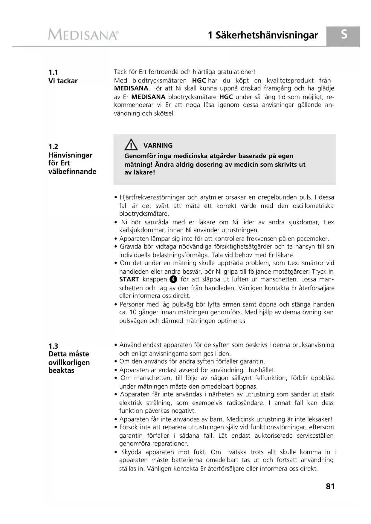 Hänvisningar för Ert välbefinnande Tack för Ert förtroende och hjärtliga gratulationer! Med blodtrycksmätaren HGC har du köpt en kvalitetsprodukt frånMEDISANA. För att Ni skall kunna uppnå önskad framgång och ha glädje av Er MEDISANA blodtrycksmätare HGC under så lång tid som möjligt, re- kommenderar vi Er att noga läsa igenom dessa anvisningar gällande an-vändning och skötsel.VARNINGGenomför inga medicinska åtgärder baserade på egen mätning! Ändra aldrig dosering av medicin som skrivits ut av läkare!• Hjärtfrekvensstörningar och arytmier orsakar en oregelbunden puls. I dessafall är det svårt att mäta ett korrekt värde med den oscillometriskablodtrycksmätare.• Ni bör samråda med er läkare om Ni lider av andra sjukdomar, t.ex.kärlsjukdommar, innan Ni använder utrustningen. • Apparaten lämpar sig inte för att kontrollera frekvensen på en pacemaker.• Gravida bör vidtaga nödvändiga försiktighetsåtgärder och ta hänsyn till sinindividuella belastningsförmåga. Tala vid behov med Er läkare.• Om det under en mätning skulle uppträda problem, som t.ex. smärtor vidhandleden eller andra besvär, bör Ni gripa till följande motåtgärder: Tryck inSTART knappen för att släppa ut luften ur manschetten. Lossa man-schetten och tag av den från handleden. Vänligen kontakta Er återförsäljareeller informera oss direkt.• Personer med låg pulsvåg bör lyfta armen samt öppna och stänga handenca. 10 gånger innan mätningen genomförs. Med hjälp av denna övning kanpulsvågen och därmed mätningen optimeras.• Använd endast apparaten för de syften som beskrivs i denna bruksanvisningoch enligt anvisningarna som ges i den.• Om den används för andra syften förfaller garantin.• Apparaten är endast avsedd för användning i hushållet.• Om manschetten, till följd av någon sällsynt felfunktion, förblir uppblåstunder mätningen måste den omedelbart öppnas.• Apparaten får inte användas i närheten av utrustning som sänder ut starkelektrisk strålning, som exempelvis radiosändare. I annat fall kan dessfunktion påverkas negativt.• Apparaten får inte användas av barn. Medicinsk utrustning är inte leksaker!• Försök inte att reparera utrustningen själv vid funktionsstörningar, eftersomgarantin förfaller i sådana fall. Låt endast auktoriserade serviceställengenomföra reparationer.• Skydda apparaten mot fukt. Om vätska trots allt skulle komma in iapparaten måste batterierna omedelbart tas ut och fortsatt användningställas in. Vänligen kontakta Er återförsäljare eller informera oss direkt.82 1 Säkerhetshänvisningar / 2 Värt att veta