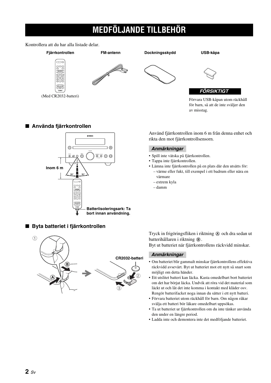 iPod AUX USB TUNER FOLDER MENU ENTER OPTION DISPLAY VOLUME MUTE TUNING MEMORY PRESET FÖRSIKTIGT (Med CR2032-batteri) Förvara USB-kåpan utom räckhåll för barn, så att de inte sväljer den av misstag. ■ Använda fjärrkontrollen Använd fjärrkontrollen inom 6 m från denna enhet och rikta den mot fjärrkontrollsensorn. Anmärkningar VOLUME INPUT PHONES