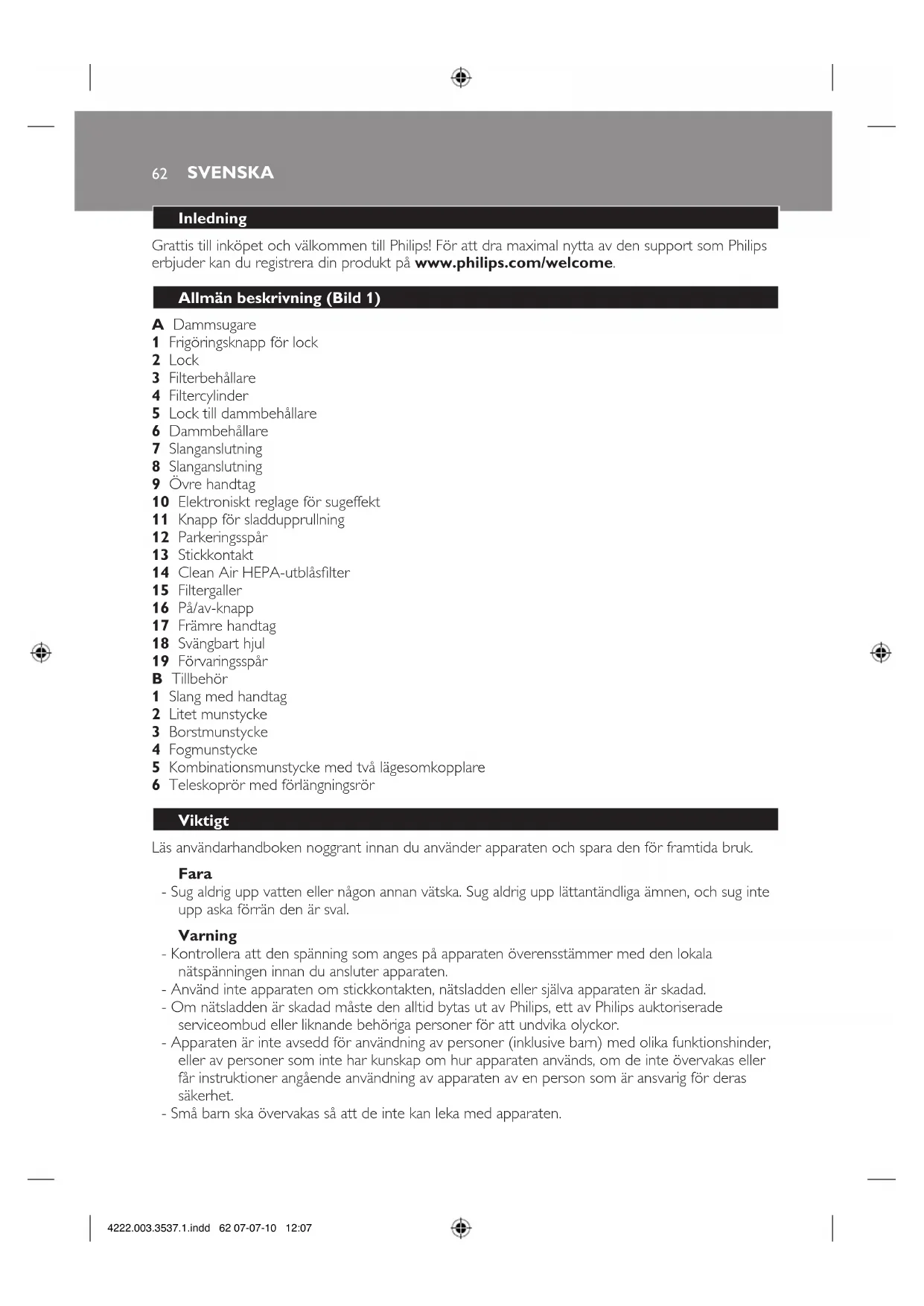 4222.003.3537.1.indd 62 07-07-10 12:07- Rikta inte slangen, röret eller annat tillbehör mot ögon eller öron och stoppa dem inte i munnen