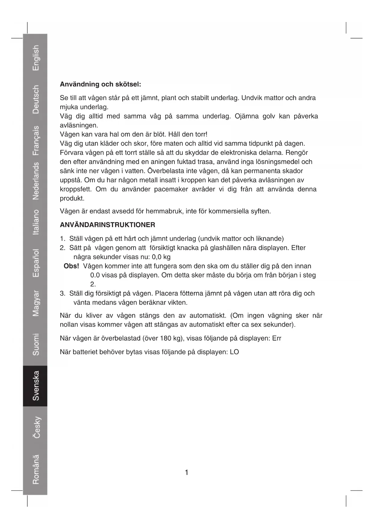 Förvara vagen på ett torrt ställe sö att du skyddar de elektroniska delarna. Rengör den after användning med en aningen fuktad trasa, använd inga losningsmedel och sänk inte ner vagen i vatten. Überbelasta inte vagen, daß kan permanenta skador uppstä. Om du har nçon metall insatt i kroppen kan det paverka avläsningen av kroppsfett. Om du använder pacemaker avråder vi dig frän att anvandaenna produit.
