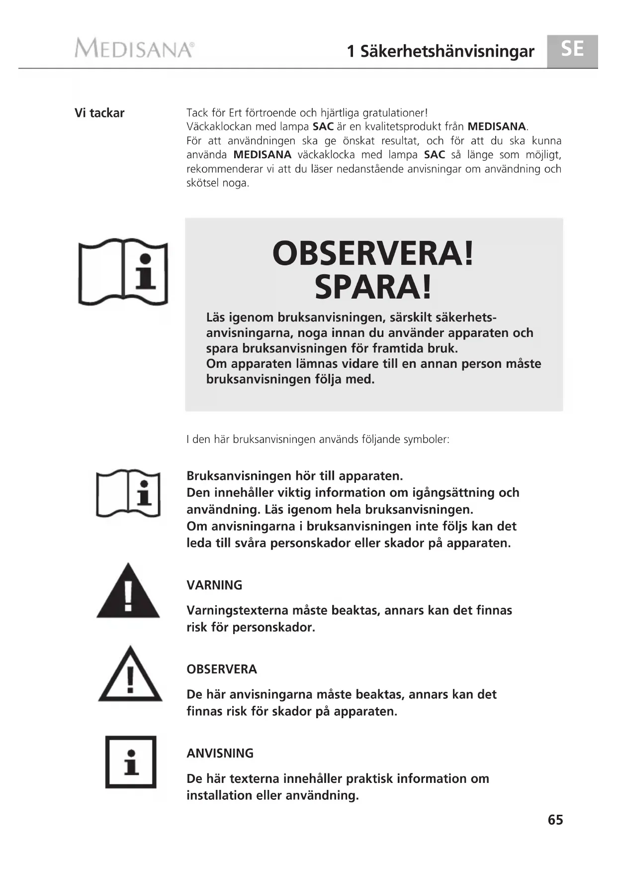 1 Säkerhetshänvisningar Vi tackar Tack för Ert förtroende och hjärtliga gratulationer! Väckaklockan med lampa SAC är en kvalitetsprodukt från MEDISANA. För att användningen ska ge önskat resultat, och för att du ska kunna använda MEDISANA väckaklocka med lampa SAC så länge som möjligt, rekommenderar vi att du läser nedanstående anvisningar om användning ochskötsel noga. OBSERVERA! SPARA! Läs igenom bruksanvisningen, särskilt säkerhets- anvisningarna, noga innan du använder apparaten och spara bruksanvisningen för framtida bruk. Om apparaten lämnas vidare till en annan person måste bruksanvisningen följa med. I den här bruksanvisningen används följande symboler: Bruksanvisningen hör till apparaten. Den innehåller viktig information om igångsättning och användning. Läs igenom hela bruksanvisningen. Om anvisningarna i bruksanvisningen inte följs kan det leda till svåra personskador eller skador på apparaten. VARNING Varningstexterna måste beaktas, annars kan det finnas risk för personskador. OBSERVERA De här anvisningarna måste beaktas, annars kan det finnas risk för skador på apparaten. ANVISNING De här texterna innehåller praktisk information om installation eller användning. GA_SAC_West_Final_neu.qxd:Lichtwecker 15.10.2008 12:17 Uhr Seite 6566 1 Säkerhetshänvisningar / 2 Drift