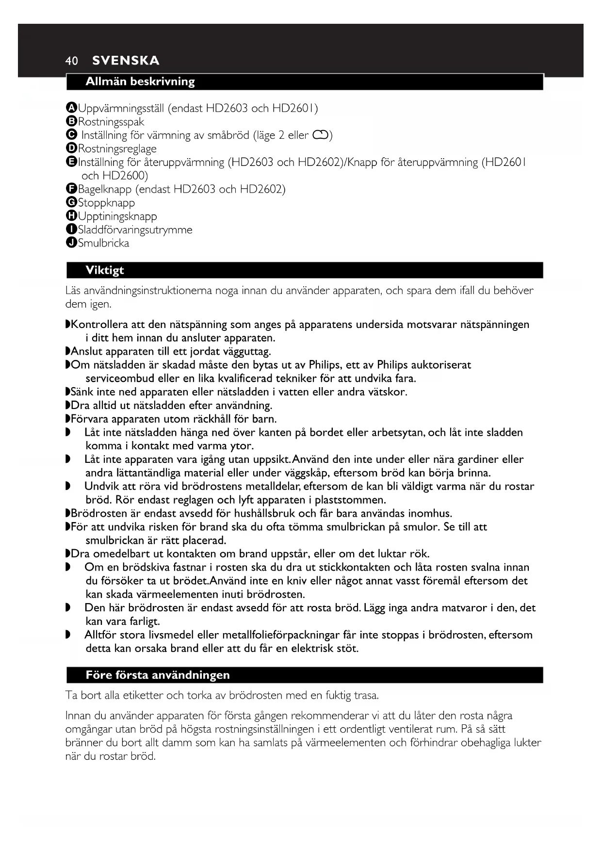 brödrosten (endast modellerna HD2603 och HD2601), se Värma småbröd och