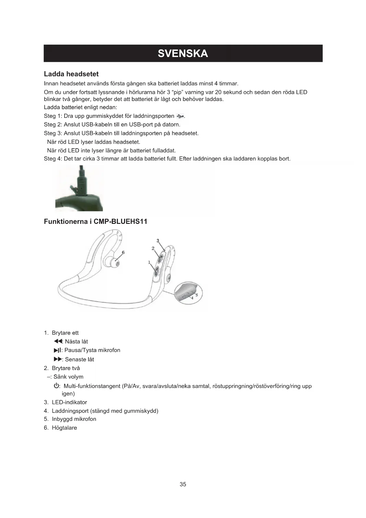 Steg 2: Anslut USB-kabeln till en USB-port på datorn. Steg 3: Anslut USB-kabeln till laddningsporten på headsetet. När röd LED lyser laddas headsetet. När röd LED inte lyser längre är batteriet fulladdat. Steg 4: Det tar cirka 3 timmar att ladda batteriet fullt. Efter laddningen ska laddaren kopplas bort. Funktionerna i CMP-BLUEHS11