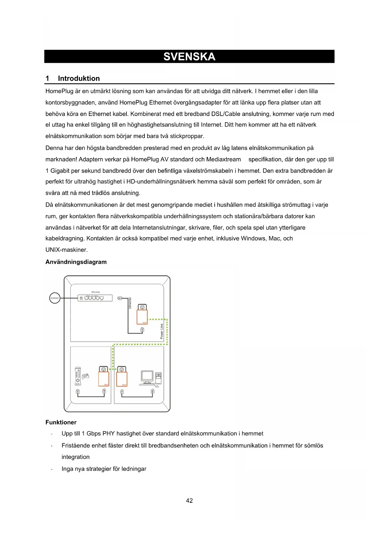 41SVENSKA HomePlug 1 Introduktion HomePlug är en utmärkt lösning som kan användas för att utvidga ditt nätverk. I hemmet eller i den lilla kontorsbyggnaden, använd HomePlug Ethernet övergångsadapter för att länka upp flera platser utan att behöva köra en Ethernet kabel. Kombinerat med ett bredband DSL/Cable anslutning, kommer varje rum med el uttag ha enkel tillgång till en höghastighetsanslutning till Internet. Ditt hem kommer att ha ett nätverk elnätskommunikation som börjar med bara två stickproppar. Denna har den högsta bandbredden presterad med en produkt av låg latens elnätskommunikation på marknaden! Adaptern verkar på HomePlug AV standard och Mediaxtream specifikation, där den ger upp till 1 Gigabit per sekund bandbredd över den befintliga växelströmskabeln i hemmet. Den extra bandbredden är perfekt för ultrahög hastighet i HD-underhållningsnätverk hemma såväl som perfekt för områden, som är svåra att nå med trådlös anslutning. Då elnätskommunikationen är det mest genomgripande mediet i hushållen med åtskilliga strömuttag i varje rum, ger kontakten flera nätverkskompatibla underhållningssystem och stationära/bärbara datorer kan användas i nätverket för att dela Internetanslutningar, skrivare, filer, och spela spel utan ytterligare kabeldragning. Kontakten är också kompatibel med varje enhet, inklusive Windows, Mac, och UNIX-maskiner. Användningsdiagram