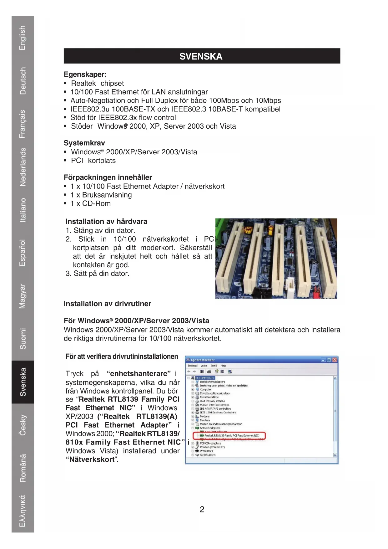 2000/XP/Server 2003/Vista Windows 2000/XP/Server 2003/Vista kommer automatiskt att detektera och installera de riktiga drivrutinerna för 10/100 nätverkskortet. För att verifiera drivrutininstallationen Tryck på “enhetshanterare” i systemegenskaperna, vilka du når från Windows kontrollpanel. Du bör se “Realtek RTL8139 Family PCI Fast Ethernet NIC” i Windows XP/2003 (“Realtek RTL8139(A) PCI Fast Ethernet Adapter” i Windows 2000; “Realtek RTL8139/ 810x Family Fast Ethernet NIC” i Windows Vista) installerad under “Nätverkskort”.3 Överensstämmelseförklaring Vi, Nedis B.V. De Tweeling 28 5215MC ’s-Hertogenbosch Holland Tel.: 0031 73 599 1055 e-post: info@nedis.com Intygar att produkten: Märke: König Electronic Modell: CMP-NWCARD12 Beskrivning: 10/100 Mbit PCI nätverkskort överensstämmer med följande standarder:
