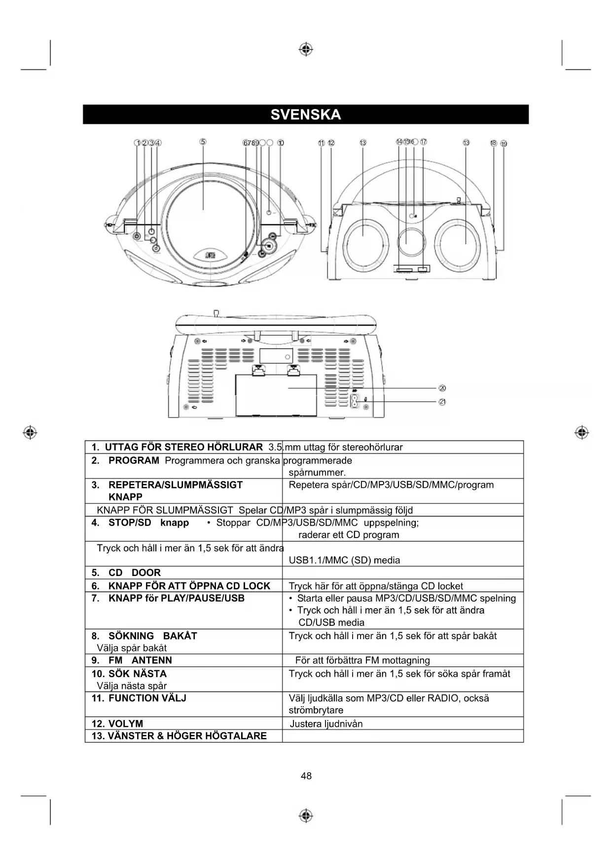 | 17. USB SLOT KOMPATIBEL För att lyssna till MP3 musikfiler på ditt USB minne | |
