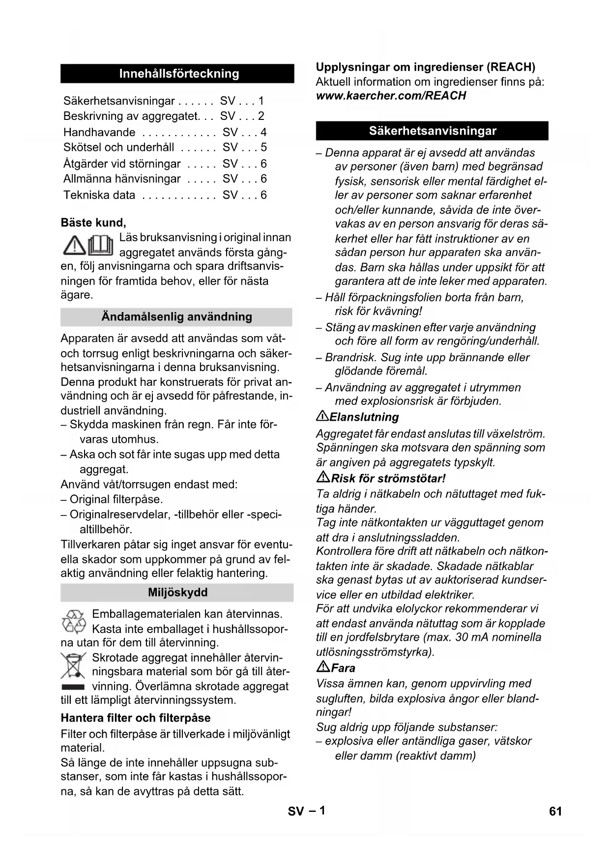 • Strømkabelen er muligvis tilsmusset, ren- gjør strømkabelen. Dersom sugeeffekten er dårlig, kontroller føl- gende punkter: Tilbehøret, sugeslange eller sugerørene er tilstoppet. Fjern tilstoppingen med en pinne. Patronfilter er tilsmusset: Ved maskiner uten Efficient filterren- gjøring: Bank ut patronfilter, skyll under rennende vann ved behov. (se beskrivelse/figur ) Ved maskiner med Efficient filterren- gjøring: Bruk filterrengjøring. (se beskrivelse/figur ) Ved behov rengjør patronfilter under ren- nende vann. (se beskrivelse/figur ) Bytt skadet patronfilter. Filterposen er full, sett inn ny filterpose. (se beskrivelse/figur ) De garantibestemmelser som er utgitt av vår distribusjonsavdeling, gjelder i alle land. Eventuelle feil på maskinen blir reparert gratis i garantitiden, dersom disse kan føres tilbake til material- eller produksjonsfeil. Ved behov for garantireparasjoner henvender du deg til din forhandler eller nærmeste autoriserte ser- viceforhandler. (Se adresse på baksiden) Våre KÄRCHER-avdelinger hjelper deg gjer- ne ved feil eller om du har spørsmål. (Se adresse på baksiden) Et utvalg av de vanligste reservedelene finner du bak i denne bruksanvisningen. Reservedeler og tilbehør får du hos din for- handler eller ved en KÄRCHER-avdeling. (Se adresse på baksiden) De tekniske data finner du på utfoldet klaff. Under finner du forklaring på symbolene brukt der. Det tas forbehold om tekniske endringer! Feilretting Innrulling av strømkabel fungerer ikke Avtagende sugeeffekt Generelle merknader Garanti Kundetjeneste Bestilling av reservedeler og spesialtilbehør Tekniske data Spenning Effekt P nominell Effekt P maks Maks. tilkoblingseffekt for apparat- stikkontakten Strømsikring (trege) Beholder, volum Vannopptak med håndtak Vannopptak med gulvdyse Nettledning Lydtrykksnivå (EN 60704-2-1) Vekt (uten tilbehør) 60 NOSvenska – 1 Bäste kund, Läs bruksanvisning i original innan aggregatet används första gång- en, följ anvisningarna och spara driftsanvis- ningen för framtida behov, eller för nästa ägare. Apparaten är avsedd att användas som våt- och torrsug enligt beskrivningarna och säker- hetsanvisningarna i denna bruksanvisning. Denna produkt har konstruerats för privat an- vändning och är ej avsedd för påfrestande, in- dustriell användning. – Skydda maskinen från regn. Får inte för- varas utomhus. – Aska och sot får inte sugas upp med detta aggregat. Använd våt/torrsugen endast med: – Original filterpåse. – Originalreservdelar, -tillbehör eller -speci- altillbehör. Tillverkaren påtar sig inget ansvar för eventu- ella skador som uppkommer på grund av fel- aktig användning eller felaktig hantering. Emballagematerialen kan återvinnas. Kasta inte emballaget i hushållssopor- na utan för dem till återvinning. Skrotade aggregat innehåller återvin- ningsbara material som bör gå till åter- vinning. Överlämna skrotade aggregat till ett lämpligt återvinningssystem. Filter och filterpåse är tillverkade i miljövänligt material. Så länge de inte innehåller uppsugna sub- stanser, som inte får kastas i hushållssopor- na, så kan de avyttras på detta sätt. Upplysningar om ingredienser (REACH) Aktuell information om ingredienser finns på: www.kaercher.com/REACH – Denna apparat är ej avsedd att användas av personer (även barn) med begränsad fysisk, sensorisk eller mental färdighet el- ler av personer som saknar erfarenhet och/eller kunnande, såvida de inte över- vakas av en person ansvarig för deras sä- kerhet eller har fått instruktioner av en sådan person hur apparaten ska använ- das. Barn ska hållas under uppsikt för att garantera att de inte leker med apparaten. – Håll förpackningsfolien borta från barn, risk för kvävning! – Stäng av maskinen efter varje användning och före all form av rengöring/underhåll. – Brandrisk. Sug inte upp brännande eller glödande föremål. – Användning av aggregatet i utrymmen med explosionsrisk är förbjuden. 몇 Elanslutning Aggregatet får endast anslutas till växelström. Spänningen ska motsvara den spänning som är angiven på aggregatets typskylt. Risk för strömstötar! Ta aldrig i nätkabeln och nätuttaget med fuk- tiga händer. Tag inte nätkontakten ur vägguttaget genom att dra i anslutningssladden. Kontrollera före drift att nätkabeln och nätkon- takten inte är skadade. Skadade nätkablar ska genast bytas ut av auktoriserad kundser- vice eller en utbildad elektriker. För att undvika elolyckor rekommenderar vi att endast använda nätuttag som är kopplade till en jordfelsbrytare (max. 30 mA nominella utlösningsströmstyrka). Fara Vissa ämnen kan, genom uppvirvling med sugluften, bilda explosiva ångor eller bland- ningar! Sug aldrig upp följande substanser: – explosiva eller antändliga gaser, vätskor eller damm (reaktivt damm) Innehållsförteckning Säkerhetsanvisningar