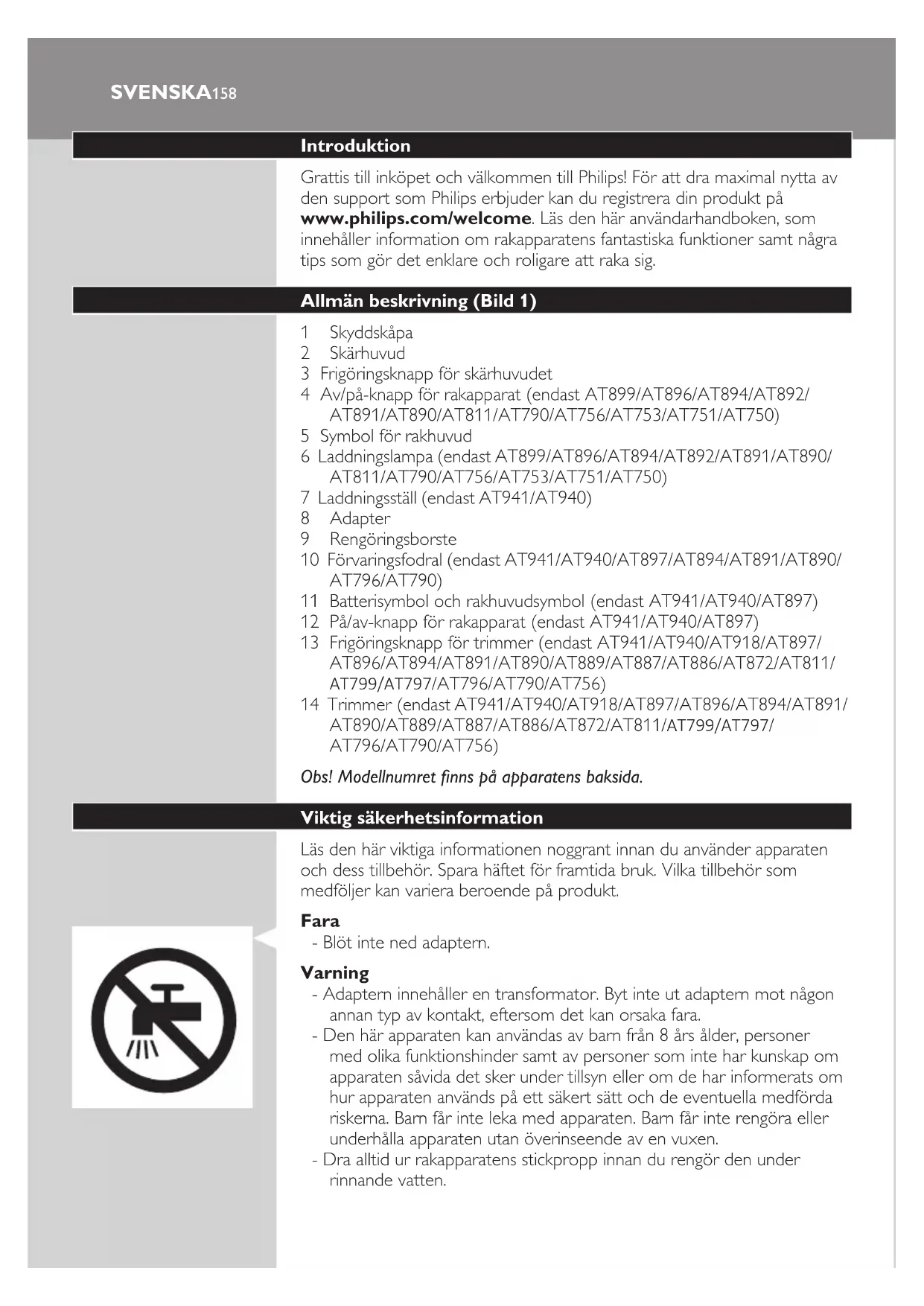 Introduktion Grattis till inköpet och välkommen till Philips! För att dra maximal nytta av den support som Philips erbjuder kan du registrera din produkt på www.philips.com/welcome. Läs den här användarhandboken, som innehåller information om rakapparatens fantastiska funktioner samt några tips som gör det enklare och roligare att raka sig. Allmän beskrivning (Bild 1) 1 Skyddskåpa 2 Skärhuvud 3 Frigöringsknapp för skärhuvudet 4 Av/på-knapp för rakapparat (endast AT899/AT896/AT894/AT892/ AT891/AT890/AT811/AT790/AT756/AT753/AT751/AT750) 5 Symbol för rakhuvud 6 Laddningslampa (endast AT899/AT896/AT894/AT892/AT891/AT890/ AT811/AT790/AT756/AT753/AT751/AT750) 7 Laddningsställ (endast AT941/AT940) 8 Adapter 9 Rengöringsborste 10 Förvaringsfodral (endast AT941/AT940/AT897/AT894/AT891/AT890/ AT796/AT790) 11 Batterisymbol och rakhuvudsymbol (endast AT941/AT940/AT897) 12 På/av-knapp för rakapparat (endast AT941/AT940/AT897) 13 Frigöringsknapp för trimmer (endast AT941/AT940/AT918/AT897/ AT896/AT894/AT891/AT890/AT889/AT887/AT886/AT872/AT811/ AT799/AT797/AT796/AT790/AT756) 14 Trimmer (endast AT941/AT940/AT918/AT897/AT896/AT894/AT891/ AT890/AT889/AT887/AT886/AT872/AT811/AT799/AT797/ AT796/AT790/AT756) Obs! Modellnumret nns på apparatens baksida. Viktig säkerhetsinformation Läs den här viktiga informationen noggrant innan du använder apparaten och dess tillbehör. Spara häftet för framtida bruk. Vilka tillbehör som medföljer kan variera beroende på produkt. Fara - Blöt inte ned adaptern. Varning - Adaptern innehåller en transformator. Byt inte ut adaptern mot någon annan typ av kontakt, eftersom det kan orsaka fara. - Den här apparaten kan användas av barn från 8 års ålder, personer med olika funktionshinder samt av personer som inte har kunskap om apparaten såvida det sker under tillsyn eller om de har informerats om hur apparaten används på ett säkert sätt och de eventuella medförda riskerna. Barn får inte leka med apparaten. Barn får inte rengöra eller underhålla apparaten utan överinseende av en vuxen. - Dra alltid ur rakapparatens stickpropp innan du rengör den under rinnande vatten.159 - Kontrollera alltid apparaten och dess tillbehör innan du använder den. Använd inte apparaten om den är skadad eftersom det kan orsaka personskador. Byt alltid ut en skadad del mot en del av originaltyp. Försiktighet - Sänk aldrig ned laddningsstället i vatten och spola inte av det under kranen. - Använd apparaten endast till det avsedda ändamålet, som framgår i användarhandboken. - Av hygieniska skäl bör apparaten endast användas av en person. - Använd inte adaptern i eller nära vägguttag som innehåller eller har innehållit en elektrisk luftrenare för att förhindra svåra skador på adaptern. - Använd aldrig tryckluft, skursvampar, slipande rengöringsmedel eller vätskor som bensin eller aceton till att rengöra enheten. - Det kan droppa vatten från uttaget nedtill på rakapparaten när du sköljer den. Det är normalt och inte farligt, eftersom all elektronik är inkapslad i en försluten strömenhet inuti rakapparaten. Elektromagnetiska fält (EMF) - Den här Philips-produkten uppfyller alla tillämpliga standarder och regler gällande exponering av elektromagnetiska fält. Allmänt - Den här rakapparaten är vattentät. Den kan användas i badkaret och duschen och sköljas under kranen. Av säkerhetsskäl kan rakapparaten därför endast användas utan sladd. - Apparaten är avsedd för nätspänning på 100–240 volt. - Adaptern omvandlar 100–240 V till en säker låg spänning på under 24 V. - Max ljudnivå: Lc = 69 dB(A) Laddning Obs! Rakapparaten kan inte drivas direkt från elnätet. När du laddar rakapparaten första gången eller när den inte har använts under en längre period måste den laddas tills laddningslampan lyser med fast sken. I nedanstående tabell anges rakapparatens laddningstid. Laddningstid 1-timmes 8 timmar AT941, AT940, AT918 AT897, AT896, AT894 AT892, AT891, AT890 AT889, AT887, AT886 AT899, AT896, AT872 , AT799, AT797, AT796, AT790, AT770, AT756, AT753, AT751, AT750 AT811 Raktiden kan vara kortare än vad som anges i tabellen nedan, beroende på rakningsvanor, rengöringsvanor eller skäggtyp. SVENSKARakningstid i minuter 60 min 50 min 45 min 40 min AT941 AT899 AT790, AT756, AT753 AT940 AT897, AT894, AT892 AT891, AT890, AT811, AT799 AT896 AT751, AT750 Laddningsindikering Låg batterinivå - AT941/AT940/AT897: När batteriet nästan är tomt (när det bara nns 5 minuters raktid kvar eller mindre), börjar den orangea batterisymbolen att blinka. När du stänger av rakapparaten fortsätter den orangea batterisymbolen att blinka i några sekunder. - AT899, AT896, AT918, AT896, AT894, AT891, AT890, AT889, AT887, AT886, AT872, AT811, AT799, AT797, AT796, AT790, AT770, AT756,AT753, AT751, AT750: När batteriet nästan är tomt (när det bara inns 5 minuters raktid kvar eller mindre) börjar laddningslampan blinka orange. När du stänger av rakapparaten fortsätter laddningslampan att blinka orange i ett par sekunder. Snabbladdning (endast AT941, AT940, AT918, AT 897, AT896, AT894, AT891, AT890, AT889, AT887, AT886, AT811) - AT941/AT940/AT897: När du börjar ladda det tomma batteriet blinkar batterisymbolen orange och vit. Obs! När batterisymbolen blinkar vit och orange mot endast vitt, kan du göra en snabb rakning på tre minuter. - AT918, AT896, AT894, AT891, AT890, AT889, AT887, AT886, AT811: När du börjar ladda det tomma batteriet, blinkar laddningslampan växelvis orange och grön. Obs! När batterisymbolen blinkar orange och grön mot endast grön, kan du göra en snabb rakning på tre minuter. SVENSKA160Laddning - AT941/AT940/AT897: När rakapparaten laddas blinkar den vita batterisymbolen. - AT899, AT896, AT872, AT799, AT797, AT796, AT790, AT770, AT756,AT753, AT751, AT750::: När rakapparaten laddas blinkar laddningslampan med ett grönt sken. Batteriet fulladdat - AT941/AT940/AT897: När b
