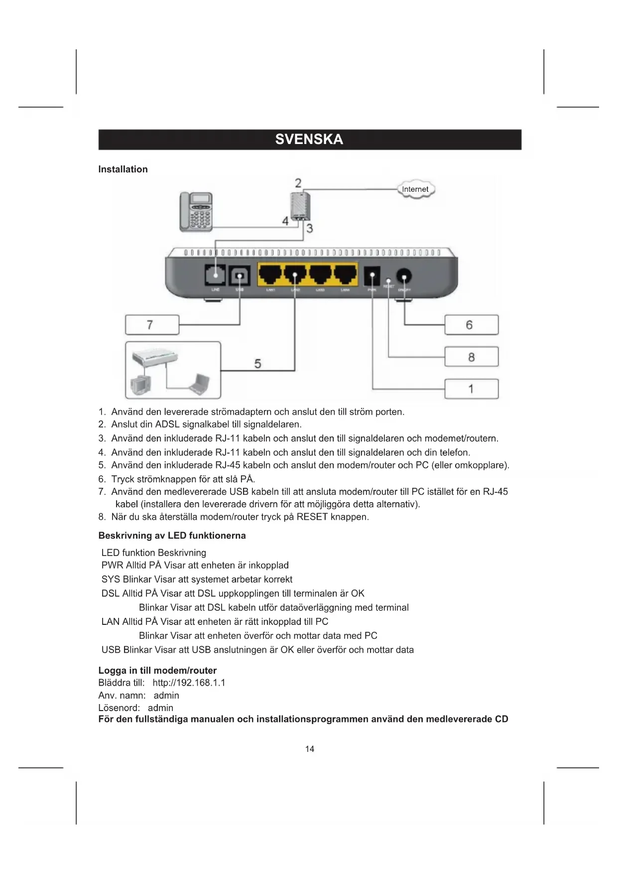 Beskrivning av LED funktionerna LED funktion Beskrivning PWR Alltid PÅ Visar att enheten är inkopplad SYS Blinkar Visar att systemet arbetar korrekt DSL Alltid PÅ Visar att DSL uppkopplingen till terminalen är OK Blinkar Visar att DSL kabeln utför dataöverläggning med terminal LAN Alltid PÅ Visar att enheten är rätt inkopplad till PC Blinkar Visar att enheten överför och mottar data med PC USB Blinkar Visar att USB anslutningen är OK eller överför och mottar data Logga in till modem/router Bläddra till: http://192.168.1.1 Anv. namn: admin Lösenord: admin För den fullständiga manualen och installationsprogrammen använd den medlevererade CD15 Säkerhetsanvisningar: För att minska risken för elektriska stötar bör denna produkt ENDAST öppnas av behörig tekniker när service behövs. Dra ut strömkabeln från eluttaget och koppla ur all annan utrustning om något problem skulle uppstå. Utsätt inte produkten för vatten eller fukt. Underhåll: Rengör endast med torr trasa. Använd inga rengöringsmedel som innehåller lösningsmedel eller slipmedel. Garanti: Ingen garanti gäller vid ändringar eller modieringar av produkten eller för skador som har uppstått på grund av felaktig användning av denna produkt. Allmänt: Utseende och specikationer kan komma att ändras utan föregående meddelande. Alla logotyper och produktnamn är varumärken eller registrerade varumärken som tillhör sina ägare och är härmed erkända som sådana. Behåll bruksanvisningen och förpackningen för eventuellt framtida behov. Obs! Produkten är märkt med denna symbol som betyder att använda elektriska eller elektroniska produkter inte får slängas bland vanliga hushållssopor. Det nns särskilda återvinningssystem för dessa produkter. ČESKY Instalace Internet