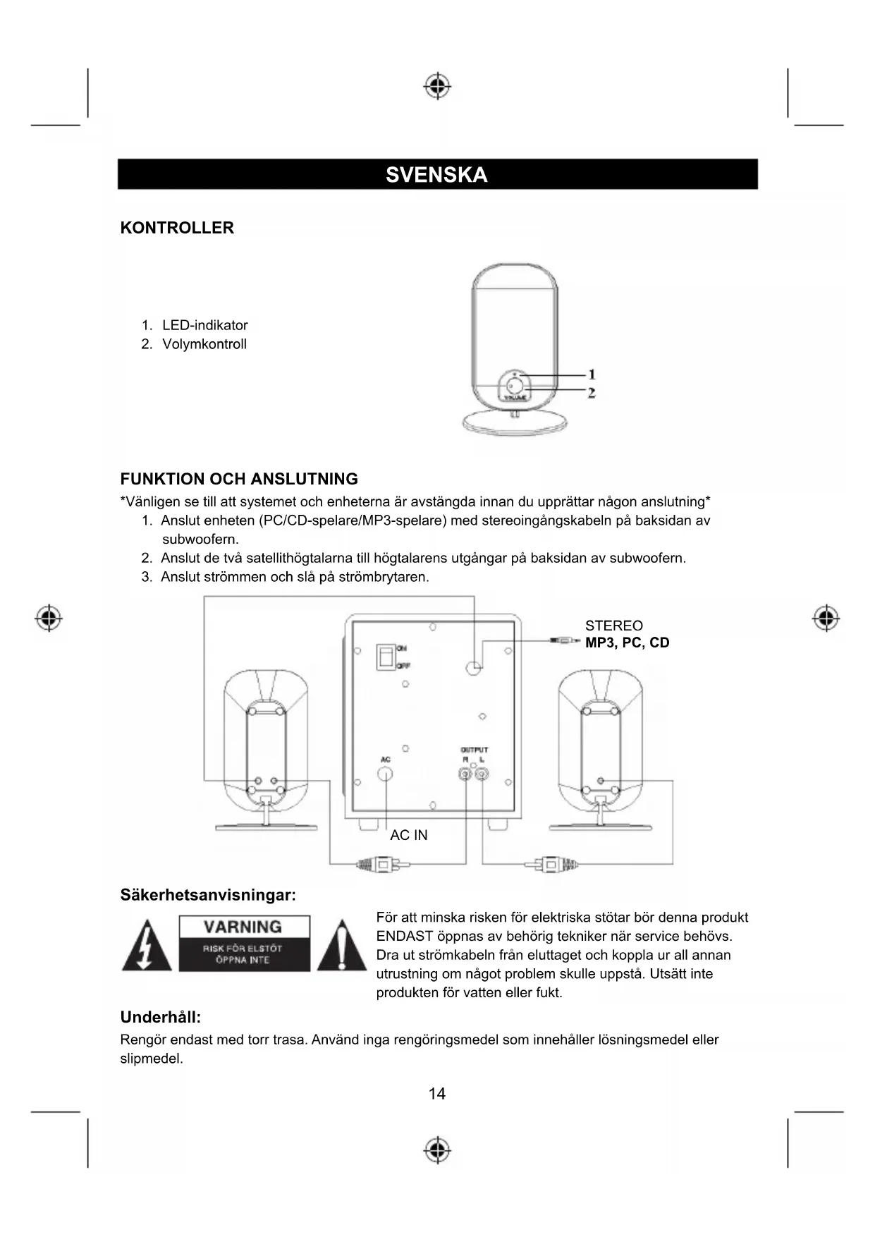 Säkerhetsanvisningar: För att minska risken för elektriska stötar bör denna produkt ENDAST öppnas av behörig tekniker när service behövs. Dra ut strömkabeln från eluttaget och koppla ur all annan utrustning om något problem skulle uppstå. Utsätt inte produkten för vatten eller fukt. Underhåll: Rengör endast med torr trasa. Använd inga rengöringsmedel som innehåller lösningsmedel eller slipmedel. STEREO MP3, PC, CD AC IN15 Garanti: Ingen garanti gäller vid ändringar eller modifieringar av produkten eller för skador som har uppstått på grund av felaktig användning av denna produkt. Allmänt: - Utseende och specifikationer kan komma att ändras utan föregående meddelande. - Alla logotyper och produktnamn är varumärken eller registrerade varumärken som tillhör sina ägare och är härmed erkända som sådana. - Den här bruksanvisningen producerades med omsorg. Dock kan inga rättigheter härröra. König Electronic kan inte acceptera ansvar för några felaktigheter i denna manual eller dess konsekvenser. - Behåll bruksanvisningen och förpackningen för eventuellt framtida behov. Obs! Produkten är märkt med denna symbol som betyder att använda elektriska eller elektroniska produkter inte får slängas bland vanliga hushållssopor. Det finns särskilda återvinningssystem för dessa produkter.