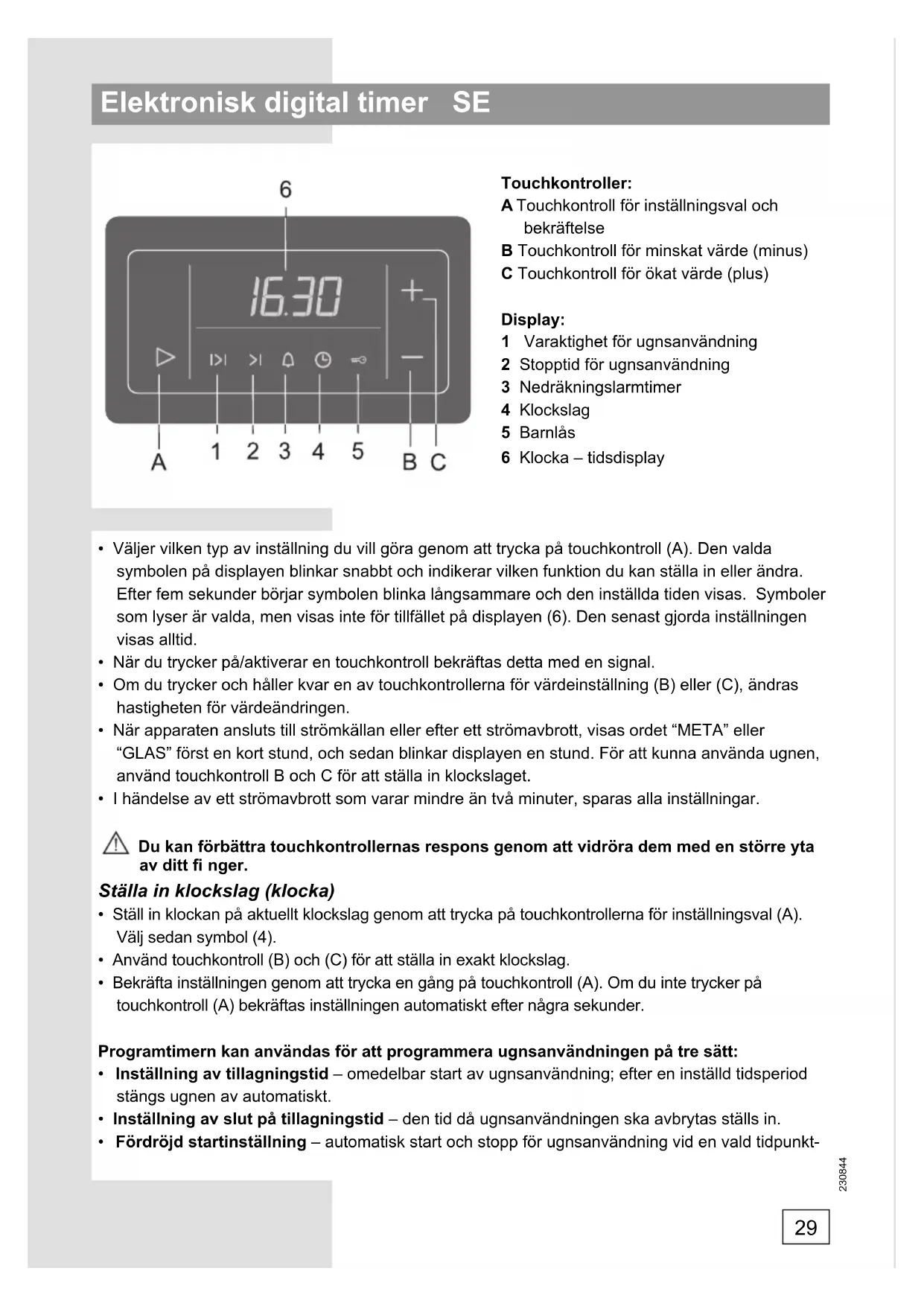 - Tryck på touchkontroll (A) für attwäla symbol (2). Aktuellt klockslag indikeras på displayen. Tryck på touchkontroll (B) och (C) für att ställa in varaktigkeit/tillagningstid.