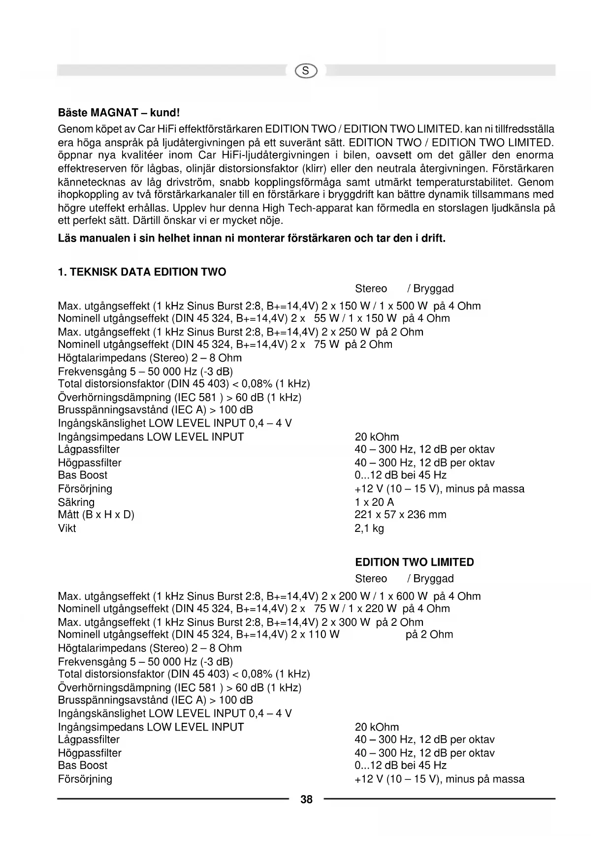 Bäste MAGNAT – kund! Genom köpet av Car HiFi effektförstärkaren EDITION TWO / EDITION TWO LIMITED. kan ni tillfredsställa era höga anspråk på ljudåtergivningen på ett suveränt sätt. EDITION TWO / EDITION TWO LIMITED. öppnar nya kvalitéer inom Car HiFi-ljudåtergivningen i bilen, oavsett om det gäller den enorma effektreserven för lågbas, olinjär distorsionsfaktor (klirr) eller den neutrala återgivningen. Förstärkaren kännetecknas av låg drivström, snabb kopplingsförmåga samt utmärkt temperaturstabilitet. Genom ihopkoppling av två förstärkarkanaler till en förstärkare i bryggdrift kan bättre dynamik tillsammans med högre uteffekt erhållas. Upplev hur denna High Tech-apparat kan förmedla en storslagen ljudkänsla på ett perfekt sätt. Därtill önskar vi er mycket nöje. Läs manualen i sin helhet innan ni monterar förstärkaren och tar den i drift.