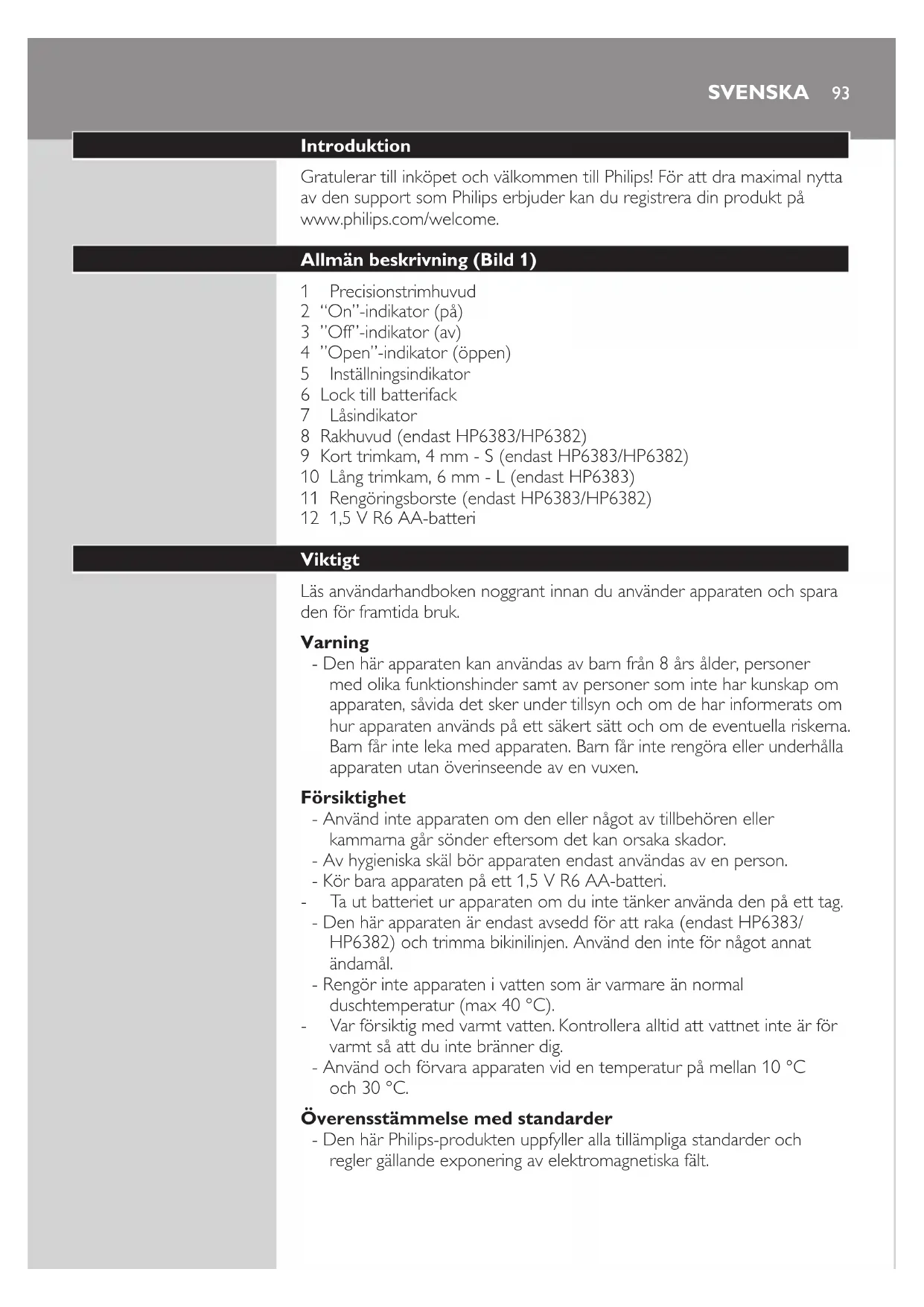 - Den här apparaten är endast avsedd för att raka (endast HP6383/