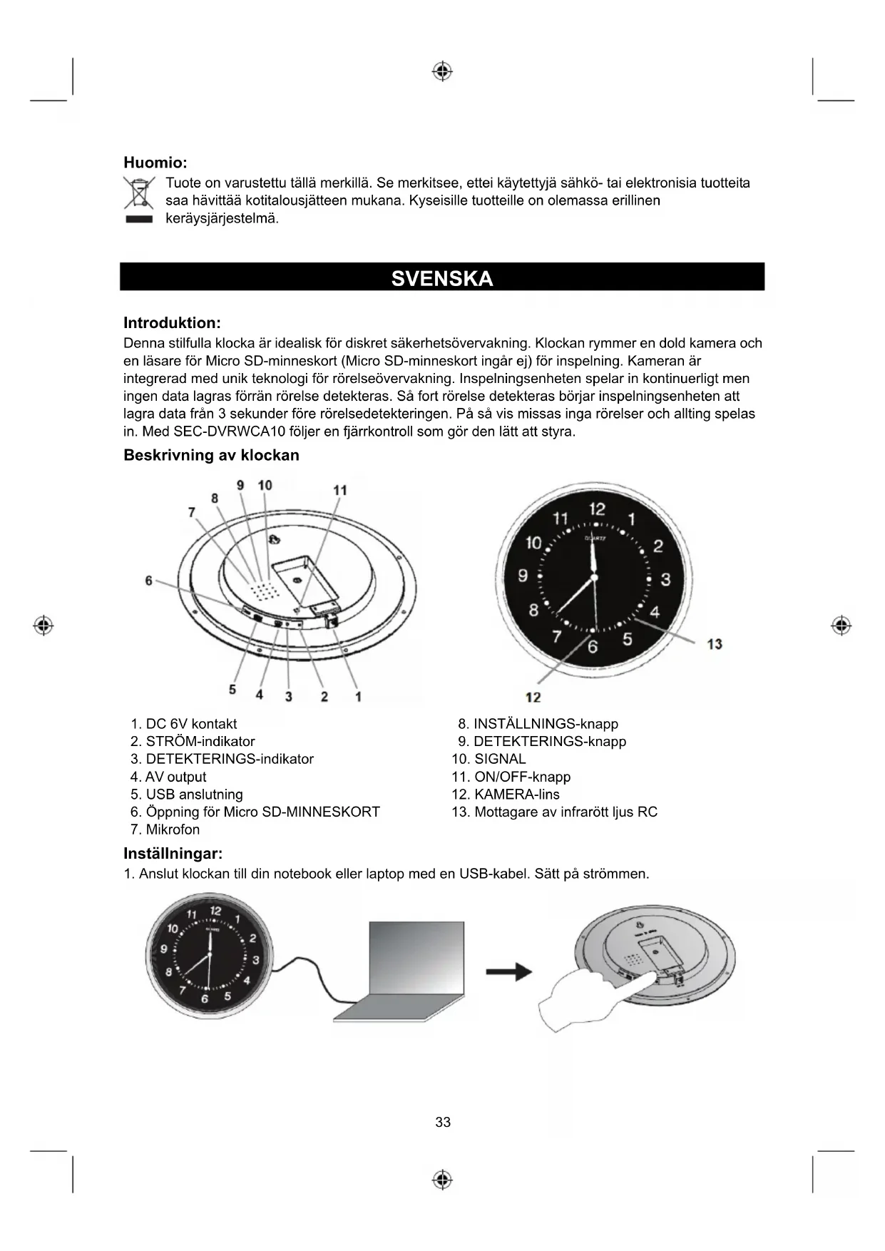 Denna stilfulla klocka ar idealisk for diskret sakerhetsovervakning. Klockan rymmer en dold kamera och en lasare for Micro SD-minneskort (Micro SD-minneskort ingar ej) for inpelning. Kameran ar integrerad med unk technologi for roelseovervakning. Inspelningsenheten spelar in kontinuierigt men ingen data lagras forran roelse detekteras. Sfort roelse detekteras bocrjar inpelningsenheten att lagra data fran 3 sekunder fore roelsedetekteringen. Pasa vis missas inga roelser och allting spelas in. Med SEC-DVRWCA10 foljer en fjarrkontroll som gor den latt att styra.