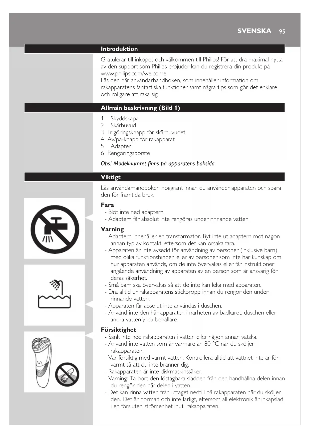 SVENSKA- Använd inte rakapparaten eller adaptern om den är trasig eftersom