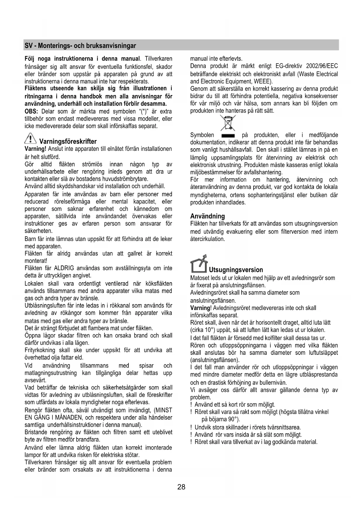 som utsugningsversion och skall anslutas till en fristående
