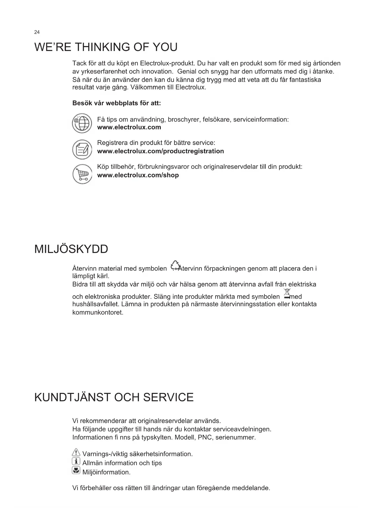 WE’RE THINKING OF YOU Tack för att du köpt en Electrolux-produkt. Du har valt en produkt som för med sig årtionden