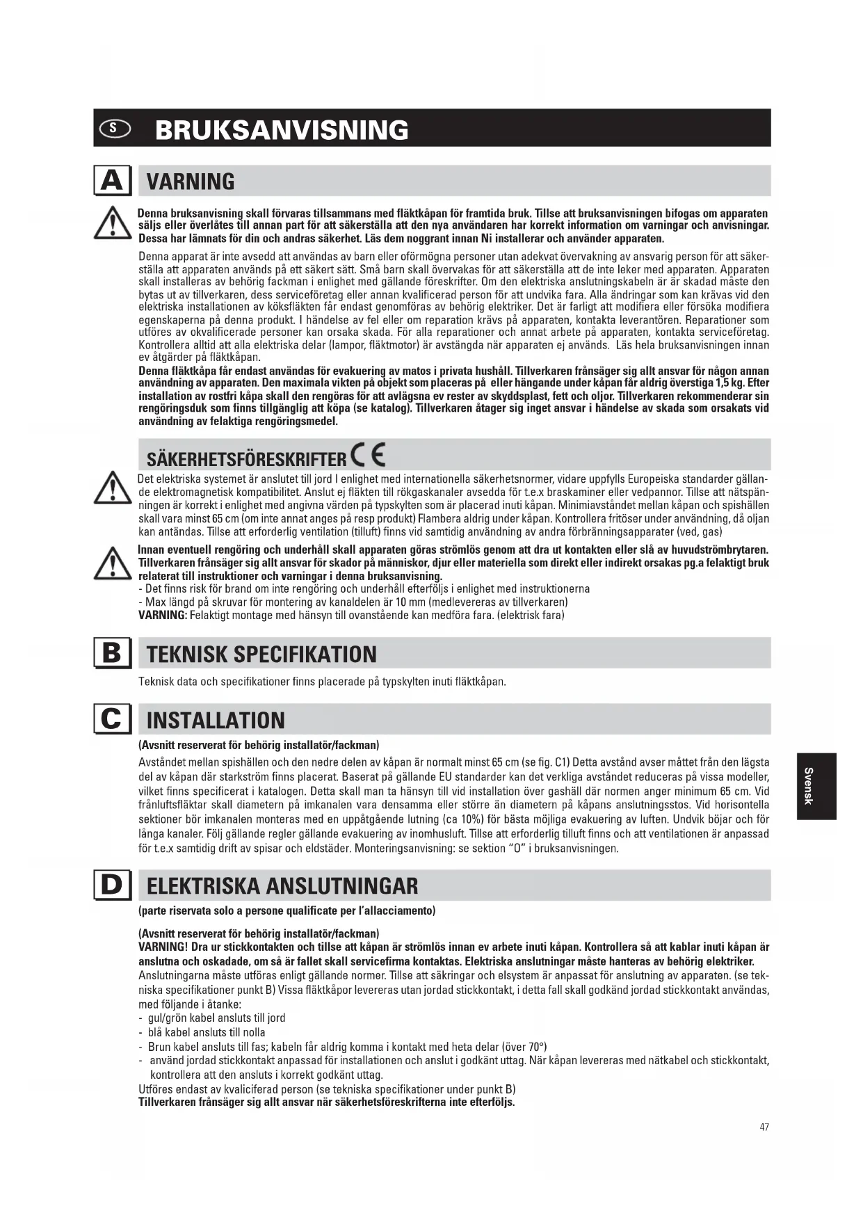 (parte riservata solo a persone qualificate per l’allacciamento)(Avsnitt reserverat för behörig installatör/fackman) VARNING! Dra ur stickkontakten och tillse att kåpan är strömlös innan ev arbete inuti kåpan. Kontrollera så att kablar inuti kåpan är anslutna och oskadade, om så är fallet skall servicefirma kontaktas. Elektriska anslutningar måste hanteras av behörig elektriker. Anslutningarna måste utföras enligt gällande normer. Tillse att säkringar och elsystem är anpassat för anslutning av apparaten. (se tek- niska specifikationer punkt B) Vissa fläktkåpor levereras utan jordad stickkontakt, i detta fall skall godkänd jordad stickkontakt användas, med följande i åtanke:- gul/grön kabel ansluts till jord- blå kabel ansluts till nolla- Brun kabel ansluts till fas; kabeln får aldrig komma i kontakt med heta delar (över 70°) - använd jordad stickkontakt anpassad för installationen och anslut i godkänt uttag. När kåpan levereras med nätkabel och stickkontakt, kontrollera att den ansluts i korrekt godkänt uttag.Utföres endast av kvaliciferad person (se tekniska specifikationer under punkt B)Tillverkaren frånsäger sig allt ansvar när säkerhetsföreskrifterna inte efterföljs.Svensk48