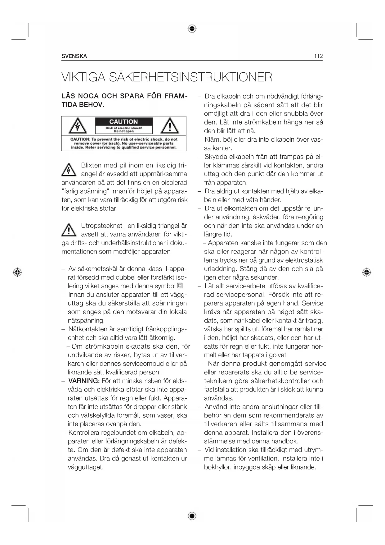 Blixten med pil inom en liksidig tri- angel är avsedd att uppmärksamma användaren på att det finns en en oisolerad "farlig spänning" innanför höljet på appara- ten, som kan vara tillräcklig för att utgöra risk för elektriska stötar. Utropstecknet i en liksidig triangel är avsett att varna användaren för vikti- ga drifts- och underhållsinstruktioner i doku- mentationen som medföljer apparaten – Av säkerhetsskäl är denna klass II-appa- rat försedd med dubbel eller förstärkt iso- lering vilket anges med denna symbol . – Innan du ansluter apparaten till ett vägg- uttag ska du säkerställa att spänningen som anges på den motsvarar din lokala nätspänning. – Nätkontakten är samtidigt frånkopplings- enhet och ska alltid vara lätt åtkomlig. – Om strömkabeln skadats ska den, för undvikande av risker, bytas ut av tillver- karen eller dennes serviceombud eller på liknande sätt kvalificerad person . – VARNING: För att minska risken för elds- våda och elektriska stötar ska inte appa- raten utsättas för regn eller fukt. Appara- ten får inte utsättas för droppar eller stänk och vätskefyllda föremål, som vaser, ska inte placeras ovanpå den. – Kontrollera regelbundet om elkabeln, ap- paraten eller förlängningskabeln är defek- ta. Om den är defekt ska inte apparaten användas. Dra då genast ut kontakten ur vägguttaget.