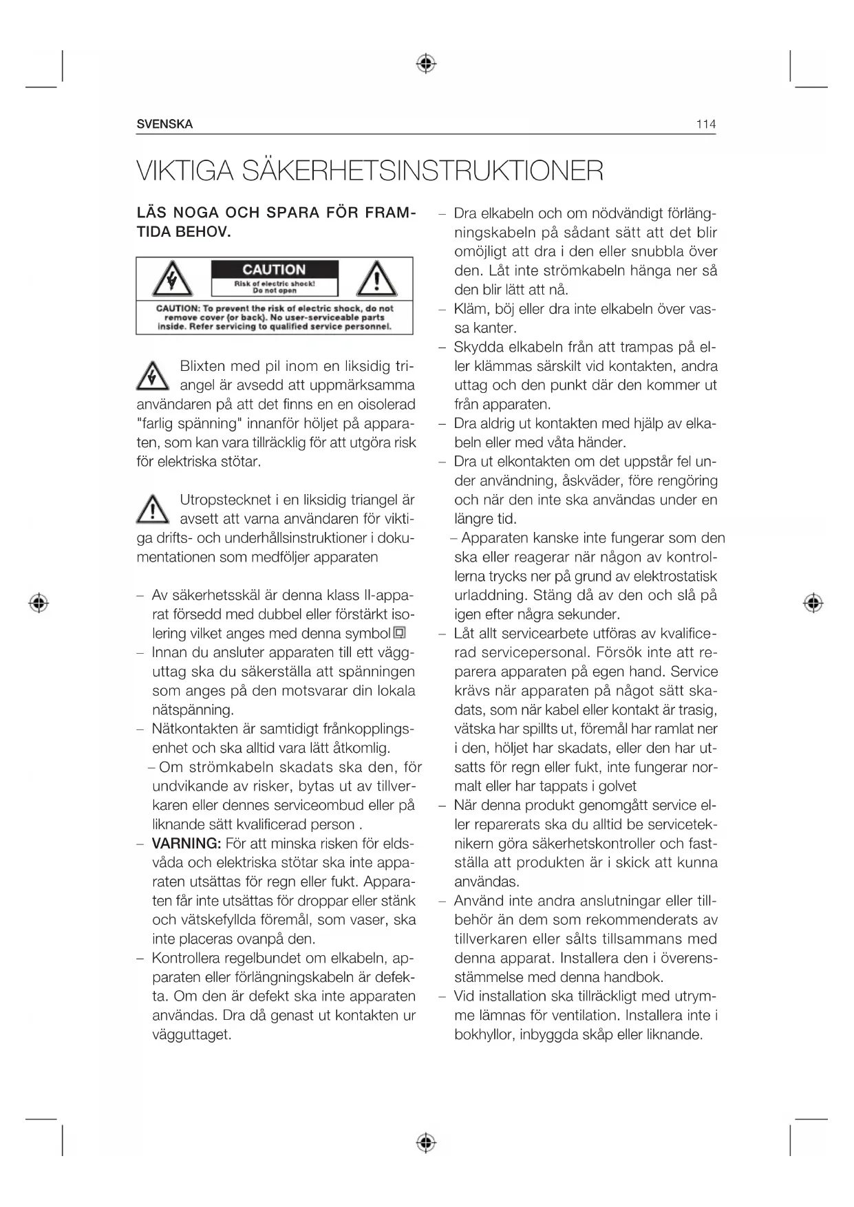 Blixten med pil inom en liksidig tri- angel är avsedd att uppmärksamma användaren på att det finns en en oisolerad "farlig spänning" innanför höljet på appara- ten, som kan vara tillräcklig för att utgöra risk för elektriska stötar. Utropstecknet i en liksidig triangel är avsett att varna användaren för vikti- ga drifts- och underhållsinstruktioner i doku- mentationen som medföljer apparaten – Av säkerhetsskäl är denna klass II-appa- rat försedd med dubbel eller förstärkt iso- lering vilket anges med denna symbol . – Innan du ansluter apparaten till ett vägg- uttag ska du säkerställa att spänningen som anges på den motsvarar din lokala nätspänning. – Nätkontakten är samtidigt frånkopplings- enhet och ska alltid vara lätt åtkomlig. – Om strömkabeln skadats ska den, för undvikande av risker, bytas ut av tillver- karen eller dennes serviceombud eller på liknande sätt kvalificerad person . – VARNING: För att minska risken för elds- våda och elektriska stötar ska inte appa- raten utsättas för regn eller fukt. Appara- ten får inte utsättas för droppar eller stänk och vätskefyllda föremål, som vaser, ska inte placeras ovanpå den. – Kontrollera regelbundet om elkabeln, ap- paraten eller förlängningskabeln är defek- ta. Om den är defekt ska inte apparaten användas. Dra då genast ut kontakten ur vägguttaget.