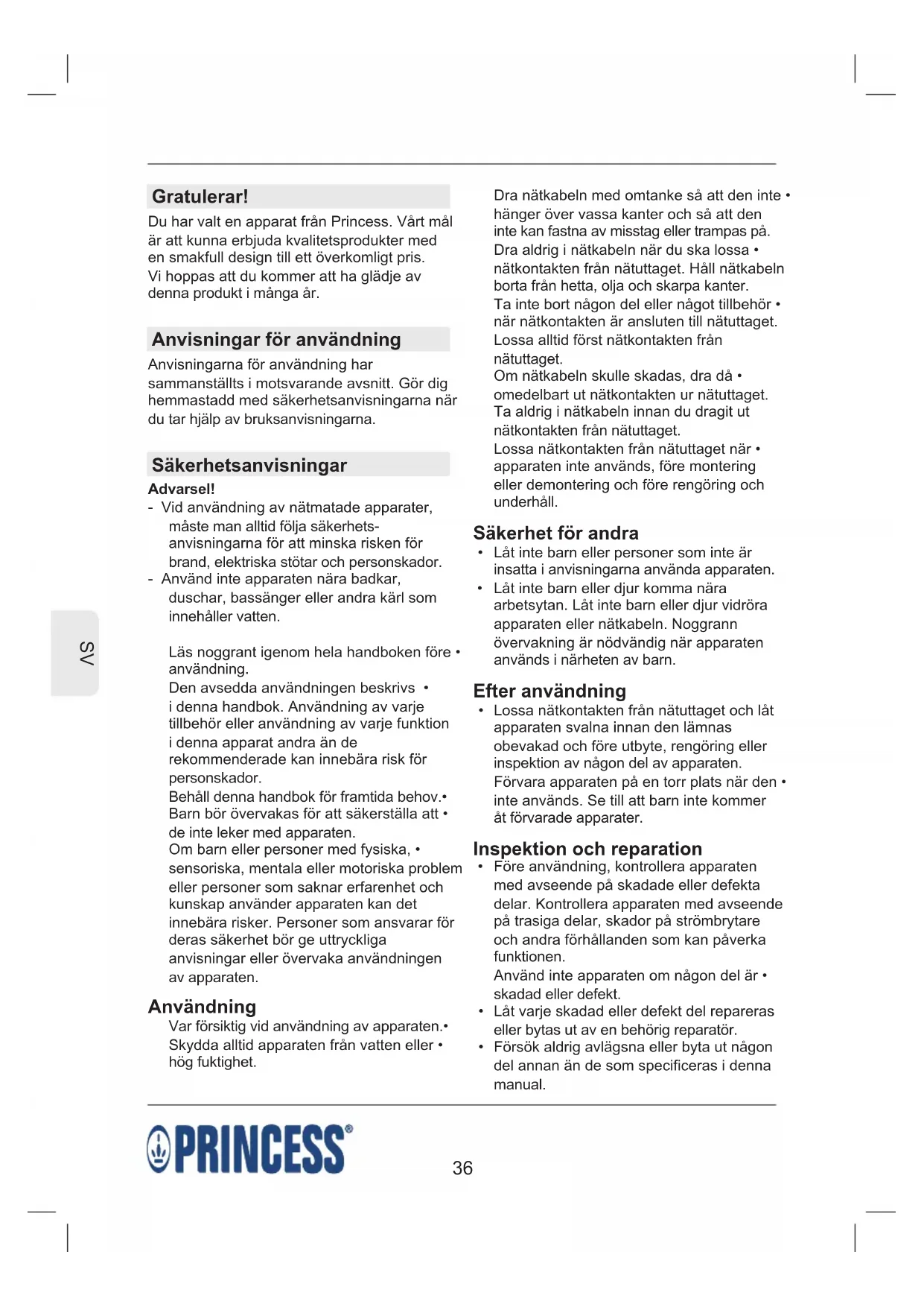 Gratulerar! Du har valt en apparat från Princess. Vårt mål är att kunna erbjuda kvalitetsprodukter med en smakfull design till ett överkomligt pris. Vi hoppas att du kommer att ha glädje av denna produkt i många år. Anvisningar för användning Anvisningarna för användning har sammanställts i motsvarande avsnitt. Gör dig hemmastadd med säkerhetsanvisningarna när du tar hjälp av bruksanvisningarna. Säkerhetsanvisningar Advarsel! - Vid användning av nätmatade apparater, måste man alltid följa säkerhets- anvisningarna för att minska risken för brand, elektriska stötar och personskador. - Använd inte apparaten nära badkar, duschar, bassänger eller andra kärl som innehåller vatten. Läs noggrant igenom hela handboken före • användning. Den avsedda användningen beskrivs • i denna handbok. Användning av varje tillbehör eller användning av varje funktion i denna apparat andra än de rekommenderade kan innebära risk för personskador. Behåll denna handbok för framtida behov.• Barn bör övervakas för att säkerställa att • de inte leker med apparaten. Om barn eller personer med fysiska, • sensoriska, mentala eller motoriska problem eller personer som saknar erfarenhet och kunskap använder apparaten kan det innebära risker. Personer som ansvarar för deras säkerhet bör ge uttryckliga anvisningar eller övervaka användningen av apparaten. Användning Var försiktig vid användning av apparaten.• Skydda alltid apparaten från vatten eller • hög fuktighet. Dra nätkabeln med omtanke så att den inte • hänger över vassa kanter och så att den inte kan fastna av misstag eller trampas på. Dra aldrig i nätkabeln när du ska lossa • nätkontakten från nätuttaget. Håll nätkabeln borta från hetta, olja och skarpa kanter. Ta inte bort någon del eller något tillbehör • när nätkontakten är ansluten till nätuttaget. Lossa alltid först nätkontakten från nätuttaget. Om nätkabeln skulle skadas, dra då • omedelbart ut nätkontakten ur nätuttaget. Ta aldrig i nätkabeln innan du dragit ut nätkontakten från nätuttaget. Lossa nätkontakten från nätuttaget när • apparaten inte används, före montering eller demontering och före rengöring och underhåll. Säkerhet för andra Låt inte barn eller personer som inte är • insatta i anvisningarna använda apparaten. Låt inte barn eller djur komma nära • arbetsytan. Låt inte barn eller djur vidröra apparaten eller nätkabeln. Noggrann övervakning är nödvändig när apparaten används i närheten av barn. Efter användning Lossa nätkontakten från nätuttaget och låt • apparaten svalna innan den lämnas obevakad och före utbyte, rengöring eller inspektion av någon del av apparaten. Förvara apparaten på en torr plats när den • inte används. Se till att barn inte kommer åt förvarade apparater. Inspektion och reparation Före användning, kontrollera apparaten • med avseende på skadade eller defekta delar. Kontrollera apparaten med avseende på trasiga delar, skador på strömbrytare och andra förhållanden som kan påverka funktionen. Använd inte apparaten om någon del är • skadad eller defekt. Låt varje skadad eller defekt del repareras • eller bytas ut av en behörig reparatör. Försök aldrig avlägsna eller byta ut någon • del annan än de som specificeras i denna manual.37