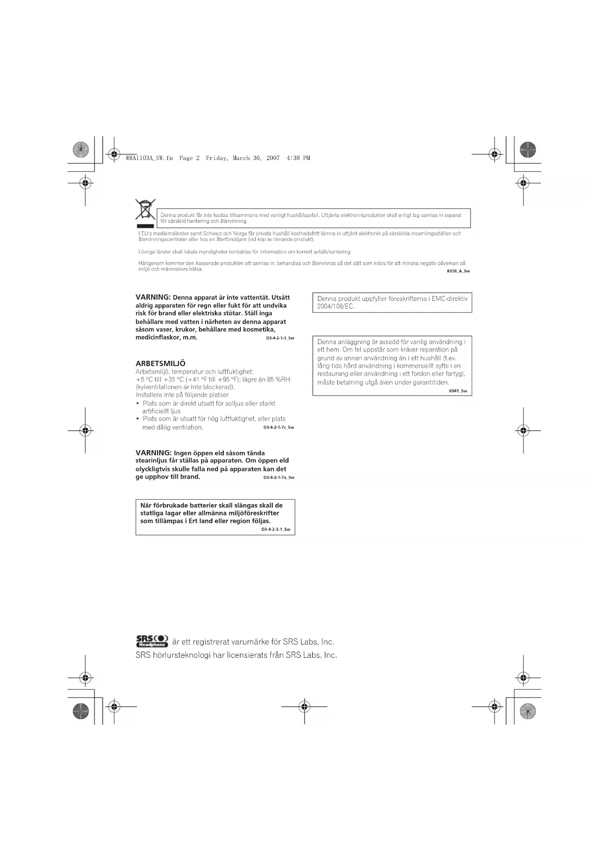 - Plats som är utsatt för hög luftfuktighet, eller plats med dålig ventilation. D3-4-2-1-7c_Sw VARNING: Ingen öppen eld såsom tända stearinljus får ställas på apparaten. Om öppen eld olyckligtvis skulle falla ned på apparaten kan det ge upphov till brand. D3-4-2-1-7a_Sw När förbrukade batterier skall slängas skall de statliga lagar eller allmänna miljöföreskrifter som tillämpas i Ert land eller region följas. D3-4-2-3-1_Sw är ett registrerat varumärke för SRS Labs, Inc. SRS hörlursteknologi har licensierats från SRS Labs, Inc. WRA1103A_SW.fm Page 2 Friday, March 30, 2007 4:38 PM3