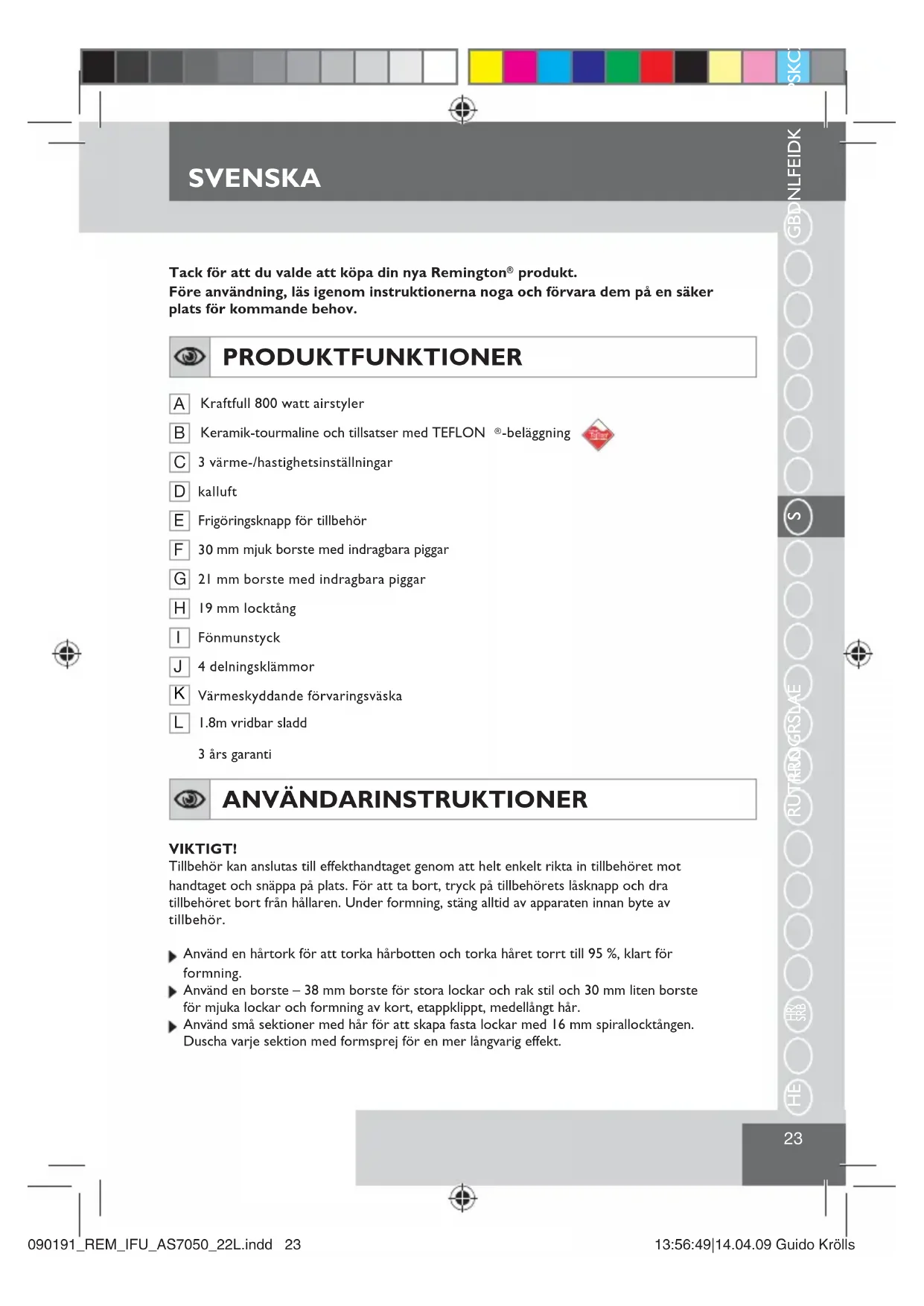 SRB HE S Denna apparat är inte avsedd för användning på frisörsalonger eller till kommersiellt bruk. Hårtorken får absolut inte användas om nätsladden skadats. Lämna i så fall in den till närmaste varumärke auktoriserade Remington ® serviceverkstad för reparation för att undvika fara. Specialverktyg krävs för undersökning, justering eller reparation. Okvalificerat reparationsarbete kan leda till riskfyllda situationer för användaren. Vi tar inget ansvar för skador på produkten, personer eller egendom som orsakats av felaktig användning, missbruk eller att dessa instruktioner inte följts. SERVICE OCH GARANTI Denna produkt har kontrollerats och är felfri. Vi garanterar denna produkt mot defekter som beror på materialfel eller tillverkningsfel under garantiperioden från inköpsdatumet. Om produkten blir defekt under garantiperioden kommer vi att reparera de defekterna eller välja att byta ut produkten eller delar den utan kostnad förutsatt att det finns inköpsbevis. Detta innebär inte en utökning av garantiperioden.Vid de fall av garantiåtgärder ring Remington ® servicecenter i din region. Denna garanti erbjuds utöver och ovanpå dina normala lagstadgade rättigheter.