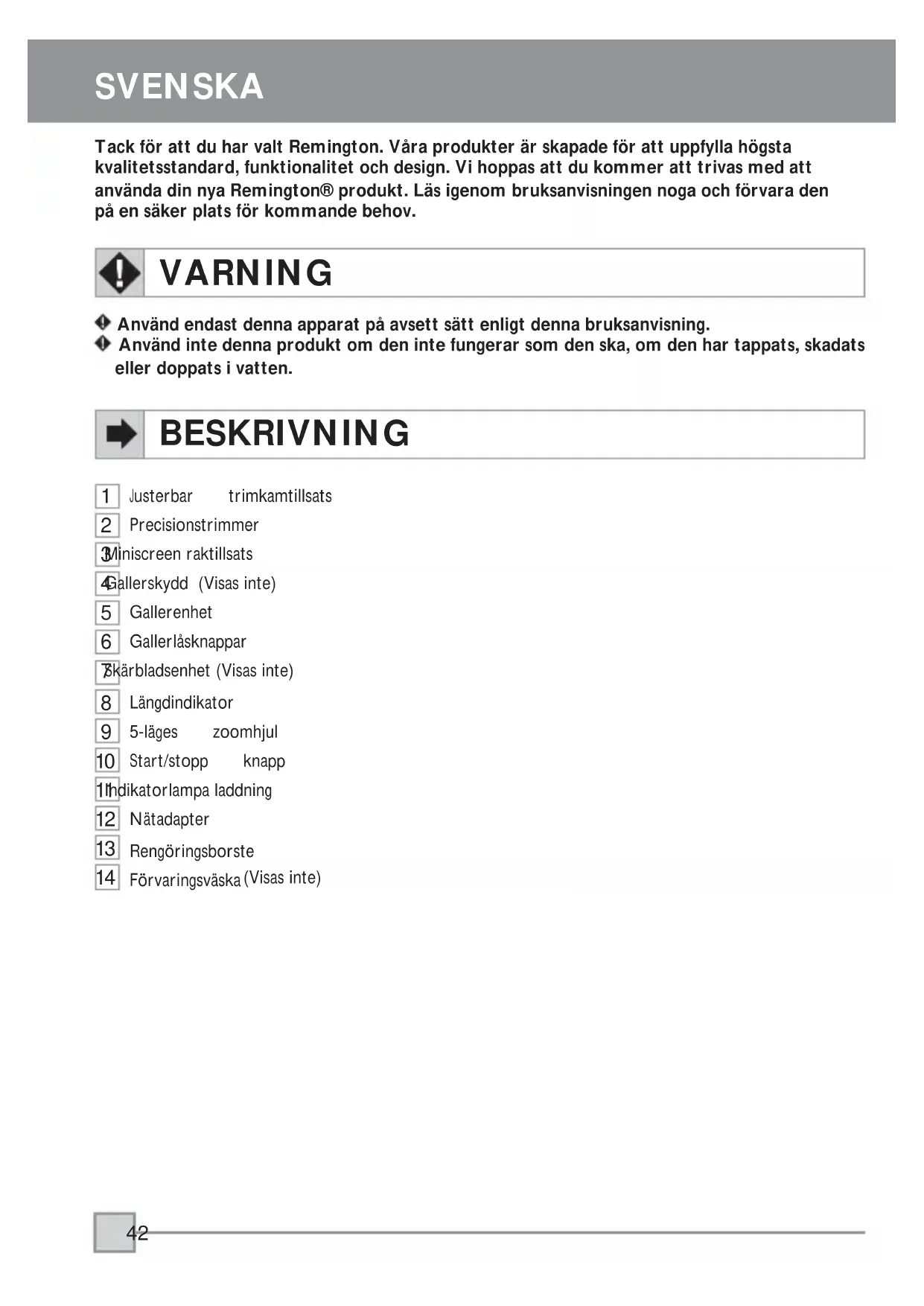 använda din nya Remington® produkt. Läs igenom bruksanvisningen noga och förvara den