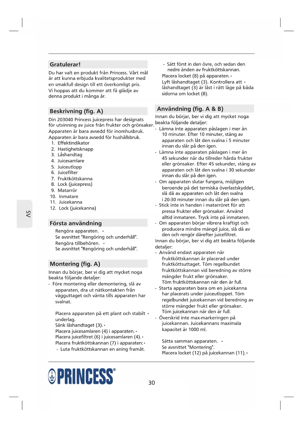 Gratulerar! Du har valt en produkt från Princess. Vårt mål är att kunna erbjuda kvalitetsprodukter med en smakfull design till ett överkomligt pris. Vi hoppas att du kommer att få glädje av denna produkt i många år. Beskrivning (fig. A) Din 203040 Princess juicepress har designats för utvinning av juice från frukter och grönsaker. Apparaten är bara avsedd för inomhusbruk. Apparaten är bara avsedd för hushållsbruk.