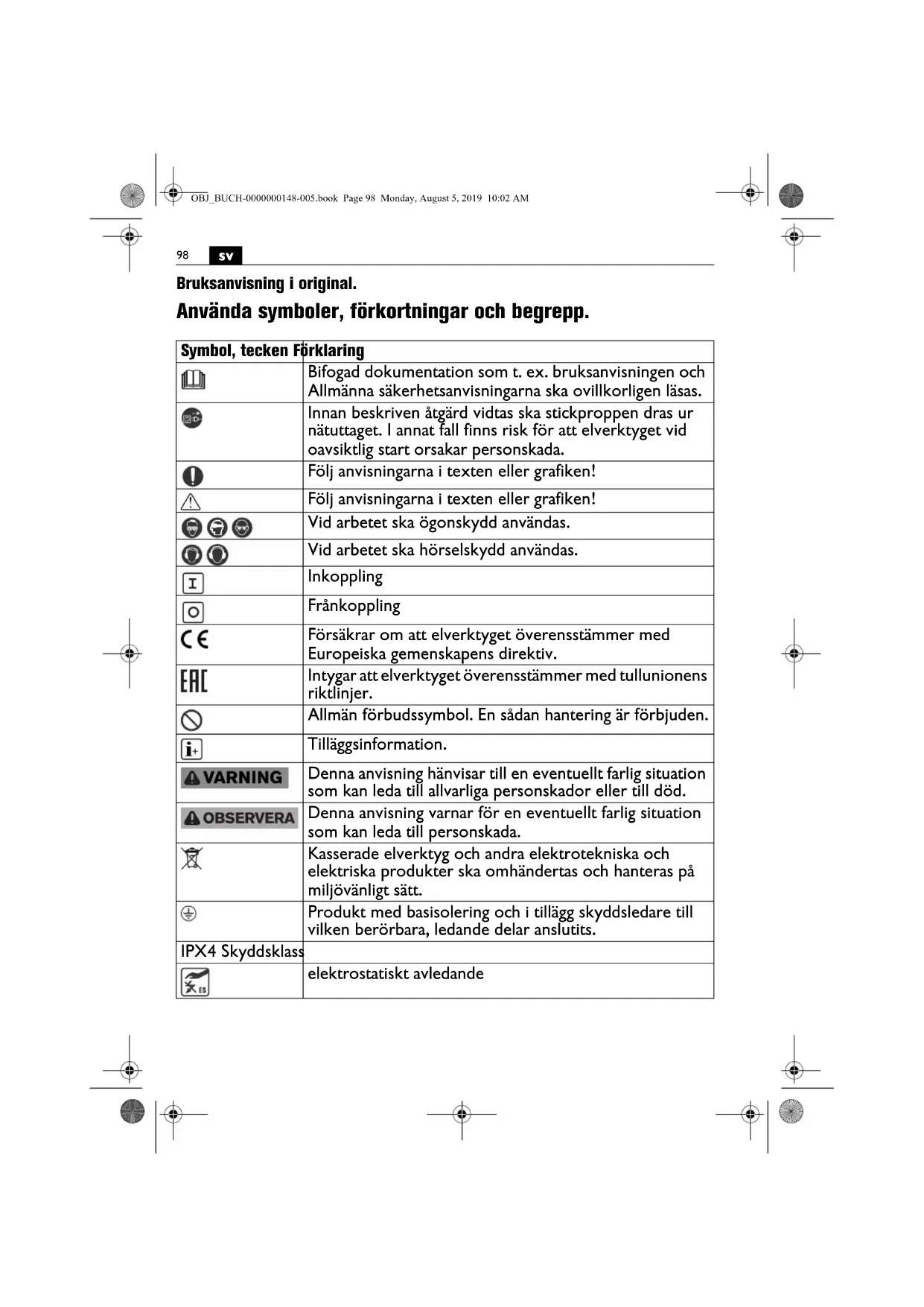 Bruksanvisning i original. Använda symboler, förkortningar och begrepp. Symbol, tecken Förklaring Bifogad dokumentation som t. ex. bruksanvisningen och Allmänna säkerhetsanvisningarna ska ovillkorligen läsas. Innan beskriven åtgärd vidtas ska stickproppen dras ur nätuttaget. I annat fall finns risk för att elverktyget vid oavsiktlig start orsakar personskada. Följ anvisningarna i texten eller grafiken! Följ anvisningarna i texten eller grafiken! Vid arbetet ska ögonskydd användas. Vid arbetet ska hörselskydd användas. Inkoppling Frånkoppling Försäkrar om att elverktyget överensstämmer med Europeiska gemenskapens direktiv. Intygar att elverktyget överensstämmer med tullunionens riktlinjer. Allmän förbudssymbol. En sådan hantering är förbjuden. Tilläggsinformation. Denna anvisning hänvisar till en eventuellt farlig situation som kan leda till allvarliga personskador eller till död. Denna anvisning varnar för en eventuellt farlig situation som kan leda till personskada. Kasserade elverktyg och andra elektrotekniska och elektriska produkter ska omhändertas och hanteras på miljövänligt sätt. Produkt med basisolering och i tillägg skyddsledare till vilken berörbara, ledande delar anslutits. IPX4 Skyddsklass elektrostatiskt avledande OBJ_BUCH-0000000148-005.book Page 98 Monday, August 5, 2019 10:02 AM99